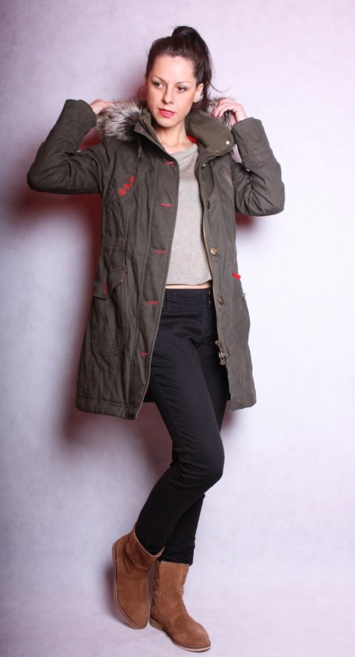 Zielona parka z kapturem obszytym futerkiem,podszewka w kolorze intensywnej czerwieni,lekko ocieplana,stan bardzo dobry