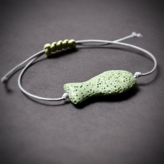 Delikatna bransoletka wykonana z szarego i zielonego sznureczka i kamyczka w kształcie rybki w kolorze blado-zielonym. Z możliwością regulacji szerokości.