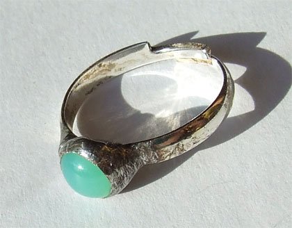 Pierścionek wykonany z szklanego, jubilerskiego, połyskującego, zielonkawego kaboszona. Całość łączona metodą witrażową, przy użyciu cyny z dodatkiem srebra. Średnica oczka około 0,6 cm. Regulowana, posrebrzana obrączka. Konstrukcja jest trwała, wodoodporna. Pierścionek pięknie mieni się i połyskuje w słońcu. Serdecznie zapraszam do zakupu tego niezwykłego rękodzieła :-)