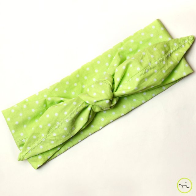 Śliczna kokardka na główkę dla małej księżniczki wykonana została z zielonej bawełny w białe kropeczki. Opaska wiązana, szyta na wymiar (w zmówieniu proszę podać obwód główki maluszka).