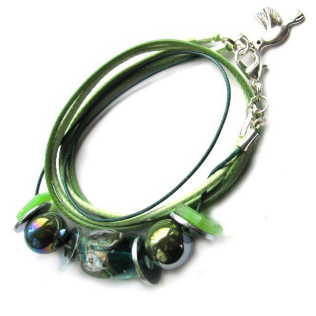 Bransoletka wykonana z 3 plecionych i woskowanych sznurków jubilerskich bardzo dobrej jakości, korali ceramicznych, lampwork, przekładek oraz dowieszki w kształcie ptaszka. Do 2-krotnego owinięcia wokół nadgarstka. Długość 41 cm ( tym 2 cm łańcuszka do regulacji) plus dowieszka, pasuje na nadgarstek 18-20 cm. Zapięcie typu karabińczyk.
