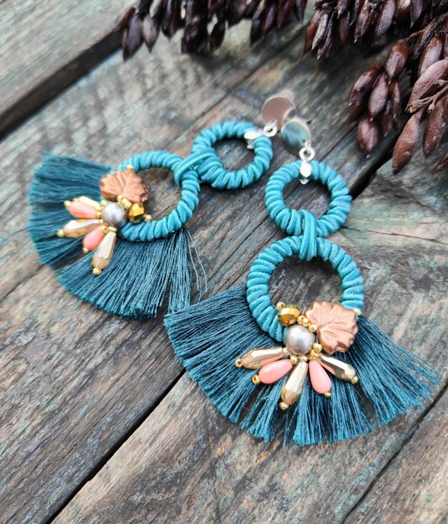,, zielone,, to urokliwe kolczyki wykonane z obręczy oplecionych ozdobnym sznurkiem. Całości kolczyka dopełnia zielony chwost i aplikacja z kolorowych koralików. Kolczyki zawieszone są na ozdobnych biglach typu sztyft wykonanych ze stali szlachetnej.