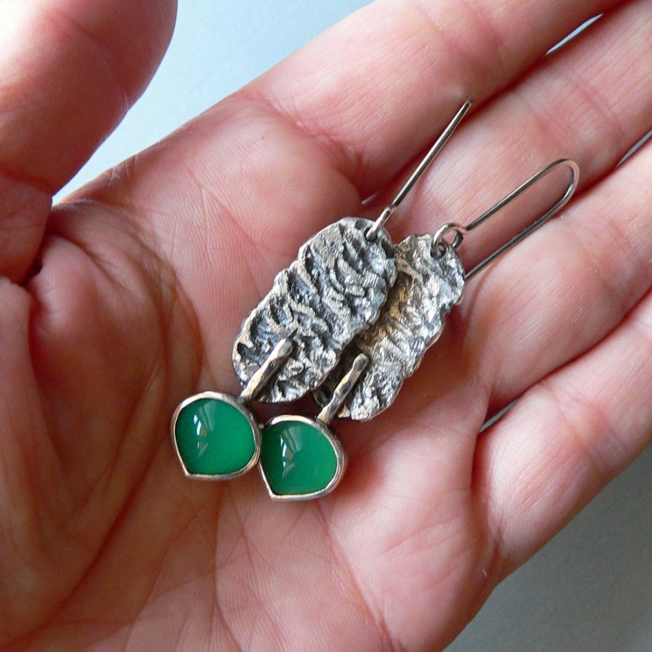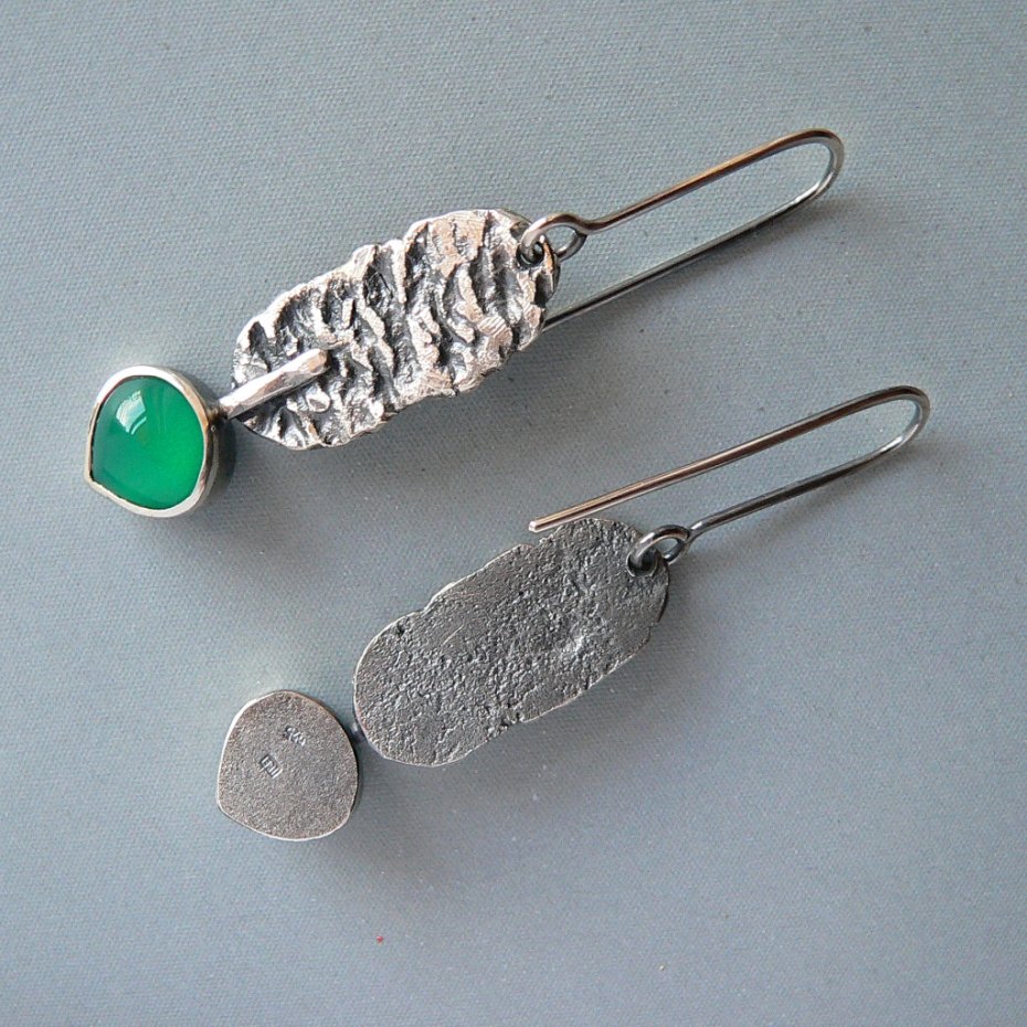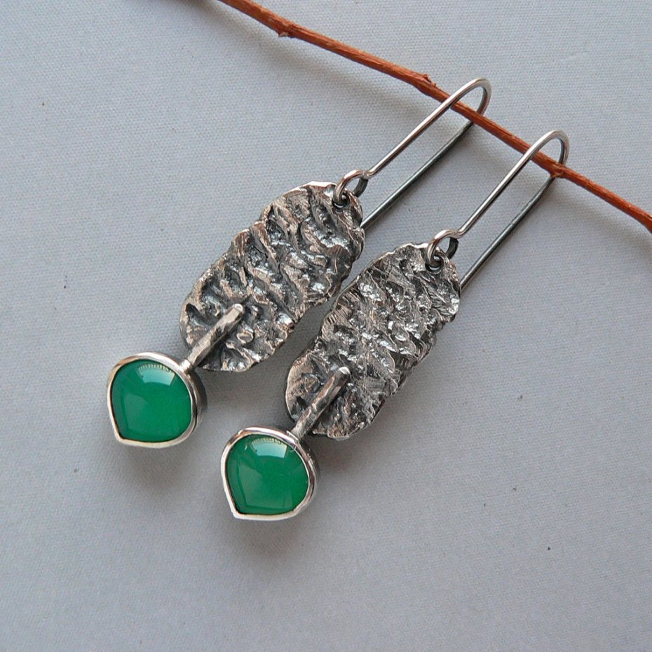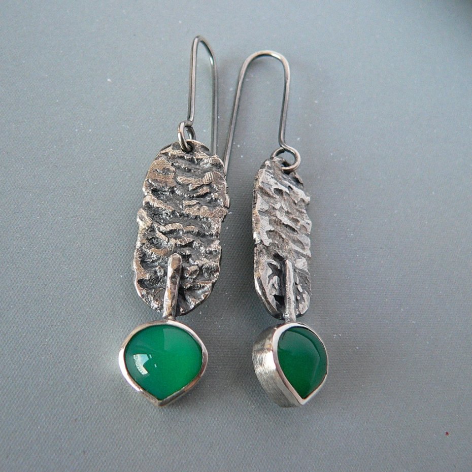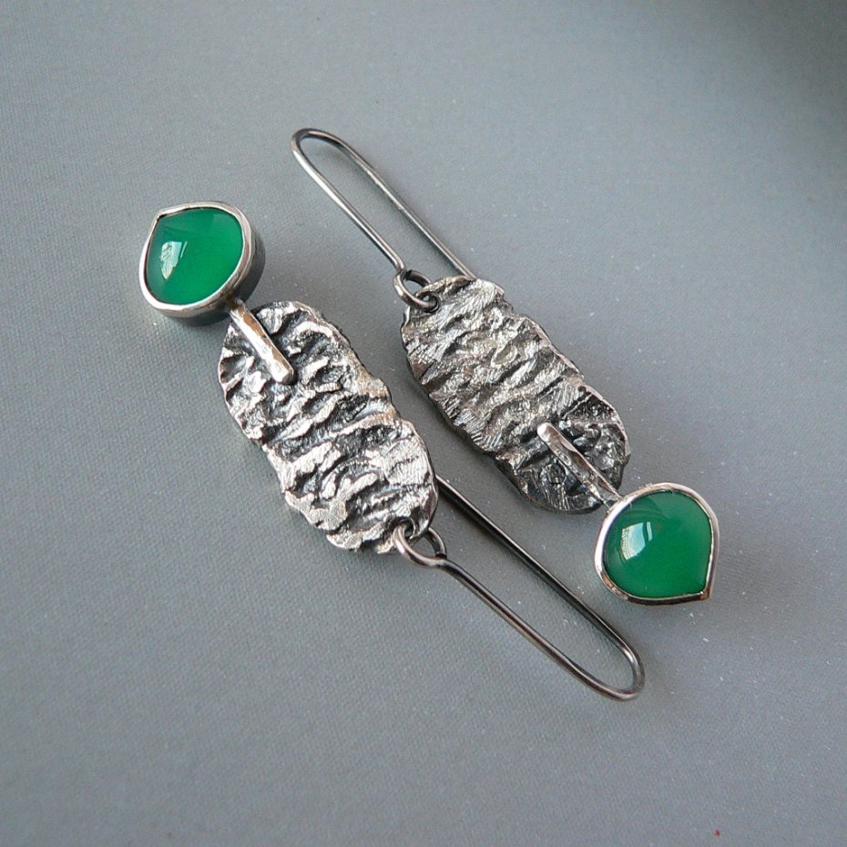 Surowe, długie kolczyki wykonane ze srebra i zielonych agatów . Srebro formowane ogniem, oksydowane dla podkreślenia wyraźnej faktury, detale polerowane, wymiary surowego elementu 2,5/1,2 cm Wymiary kamienia- 1/1 cm Długość całkowita kolczyka 6 cm, waga 5 g, nie obciążają ucha.