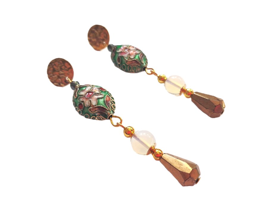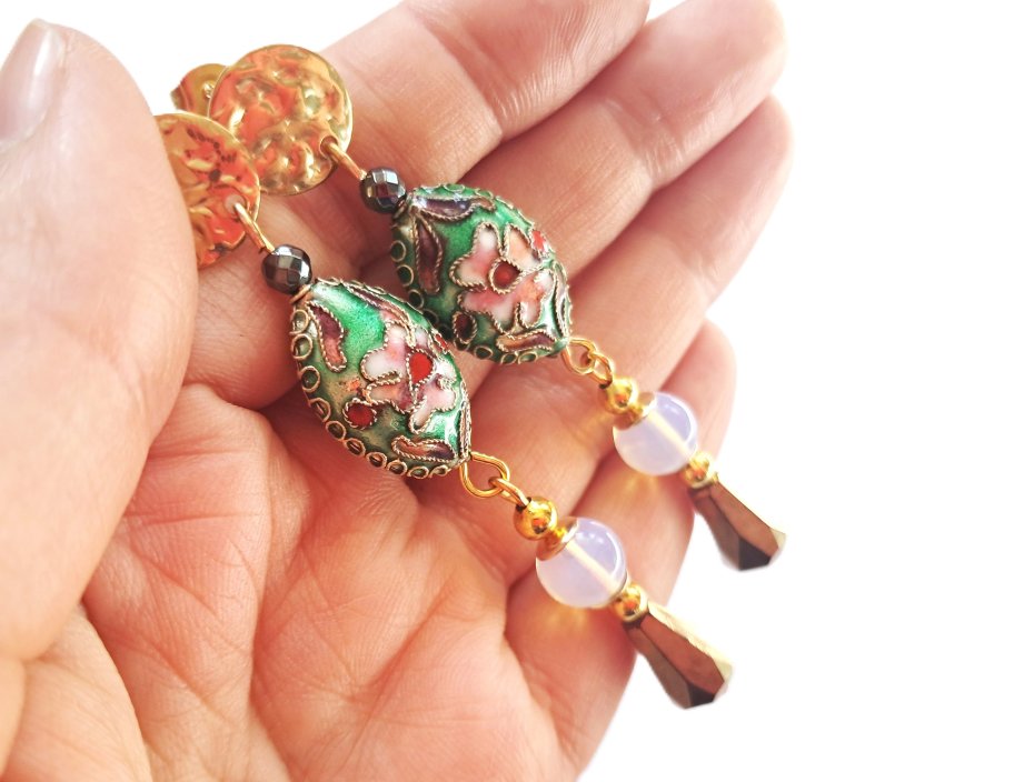 Pięknie zdobione koraliki cloisonne [emalia komórkowa], szklane fasetowane krople oraz opale w oprawie pozłacanej stali szlachetnej