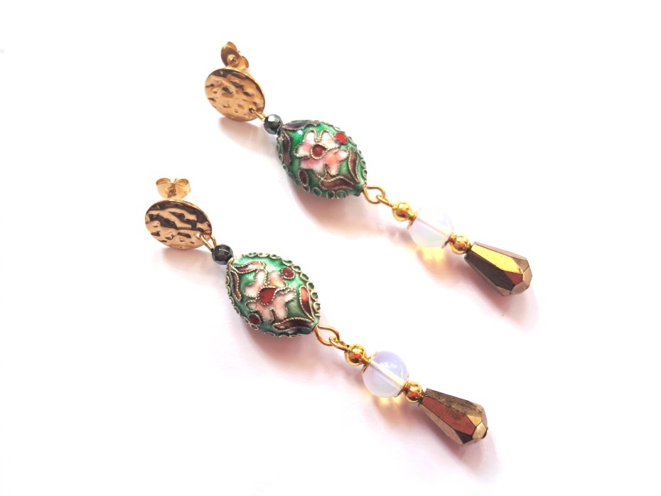 Pięknie zdobione koraliki cloisonne [emalia komórkowa], szklane fasetowane krople oraz opale w oprawie pozłacanej stali szlachetnej