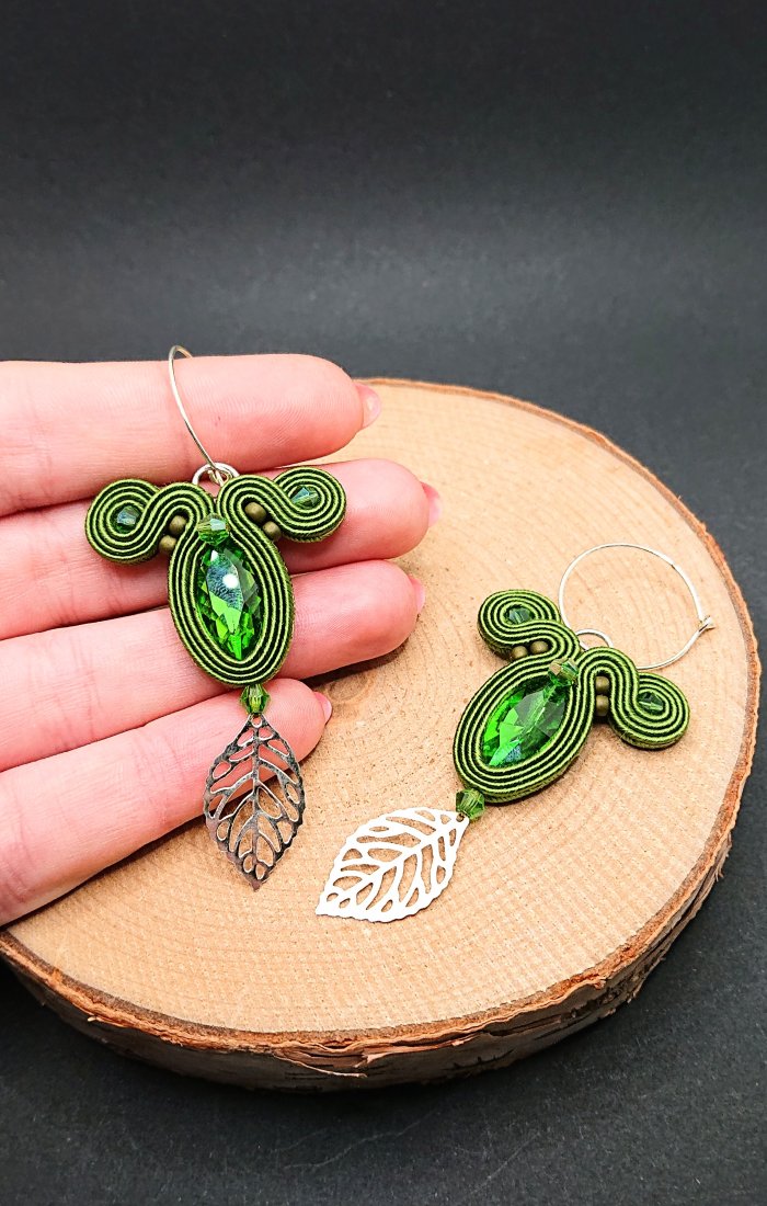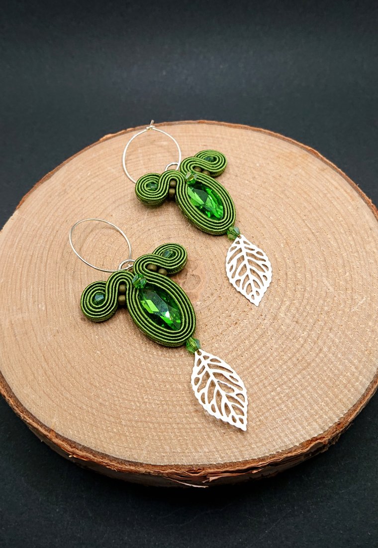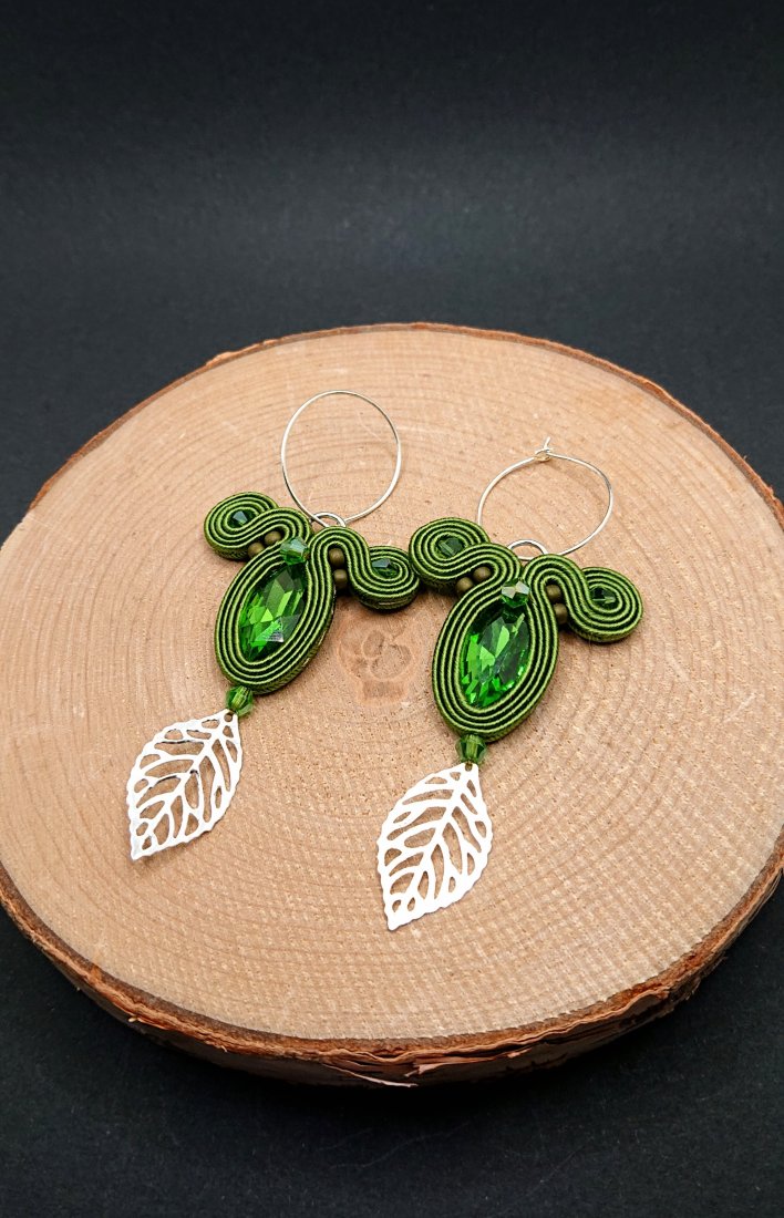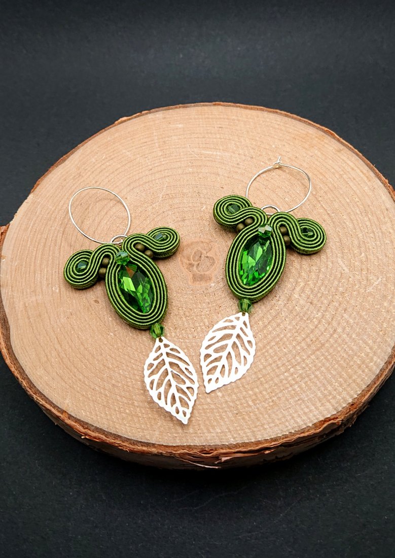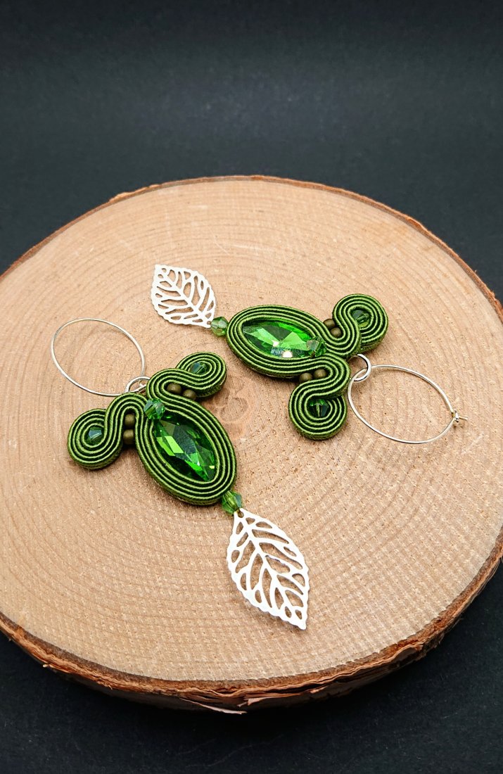Szklane fasetowane kryształki otoczone zielonymi sznurkami sutasz oraz kryształkami i japońskimi szklanymi koralikami. Dół kolczyków zdobią ażurowe liście. Kolczyki zawieszone na zamykanych kołach w kolorze srebrnym.