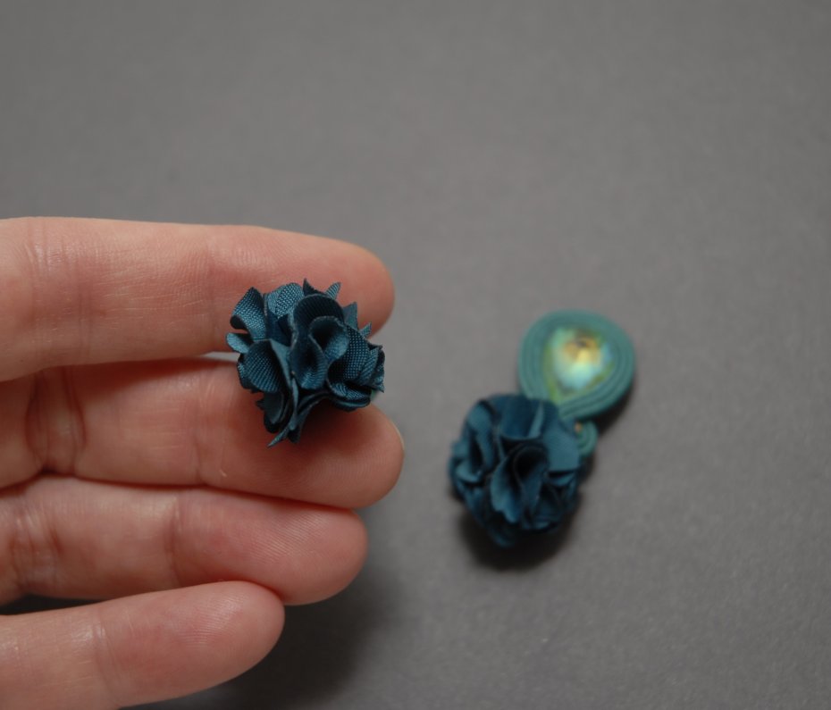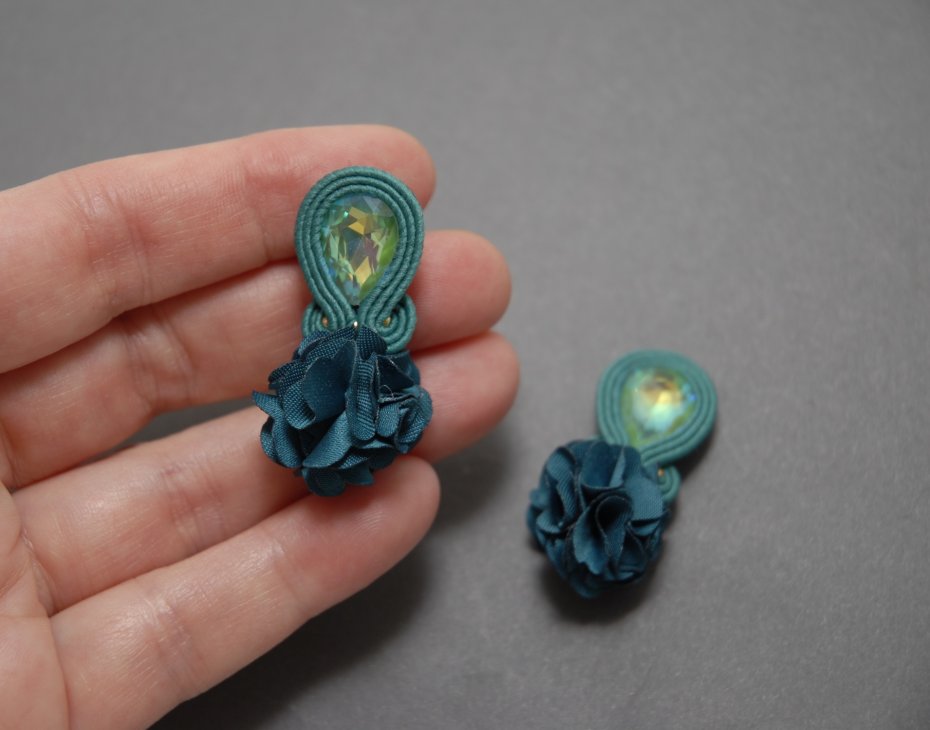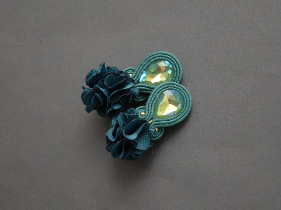 oferuję kolczyki zrobione techniką sutasz, ozdobione fasetowanym kaboszonem i kwiatkami z materiału