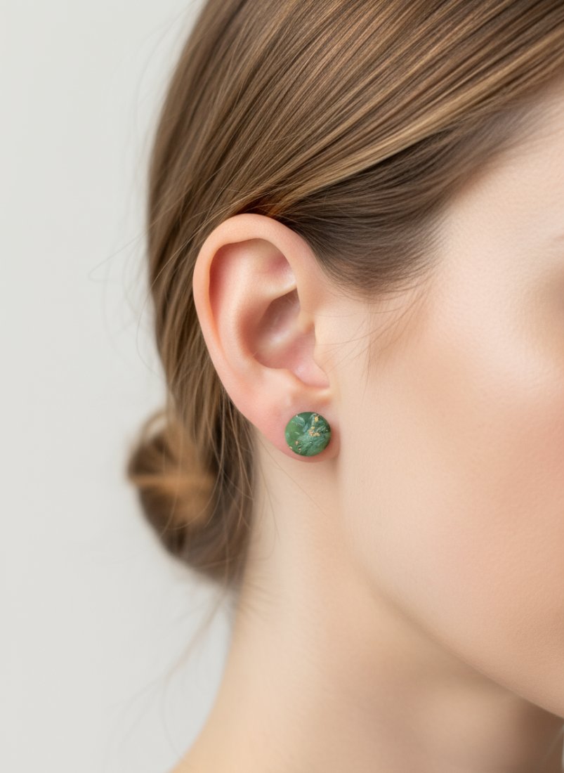 Delikatne, a jednocześnie przyciągające wzrok kolczyki – sztyfty o subtelnym, okrągłym kształcie. Wykonane ręcznie z gliny polimerowej w szlachetnym odcieniu zieleni i ozdobione subtelnymi złotymi drobinkami, które nadają im elegancji i niepowtarzalności.