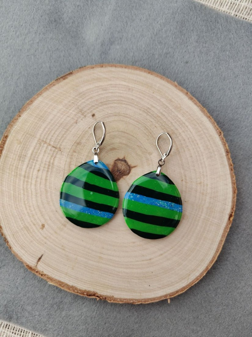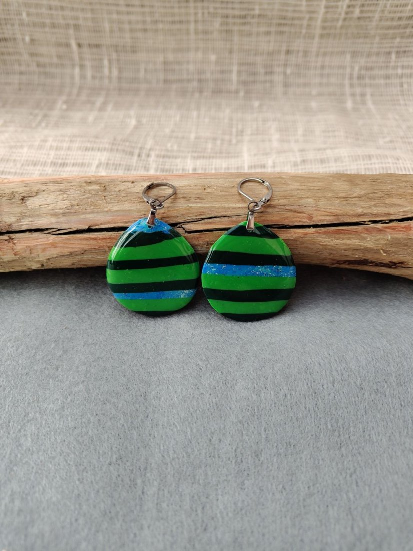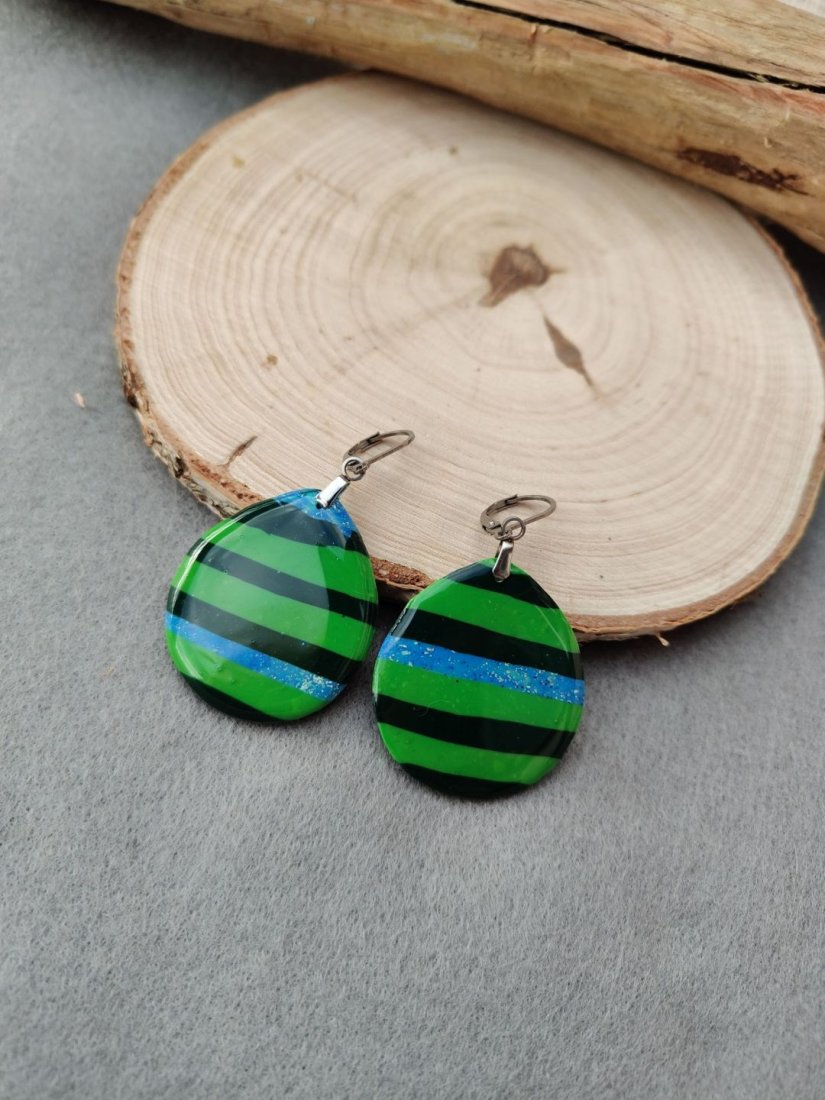 Wyjątkowe, ręcznie wykonane kolczyki z glinki polimerowej, które przyciągają uwagę intensywną zielenią przełamaną subtelnymi pasami ciemnej zieleni i delikatnym, błyszczącym akcentem. Ich powierzchnia została pokryta wysokiej jakości żywicą, co nadaje im efekt szklistości i głębi koloru. To idealny dodatek dla osób, które lubią oryginalną biżuterię i chcą podkreślić swój styl – zarówno na co dzień, jak i na wyjątkowe okazje. Lekkie i komfortowe w noszeniu, świetnie sprawdzą się jako prezent lub unikalny element Twojej kolekcji.