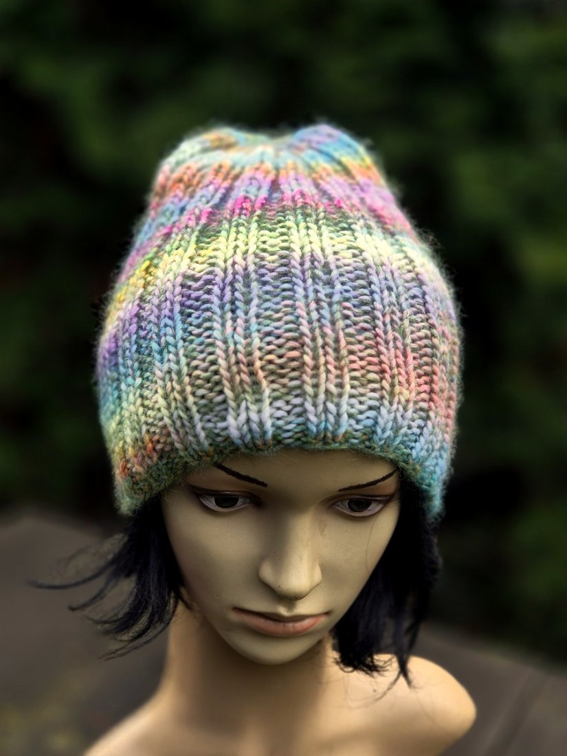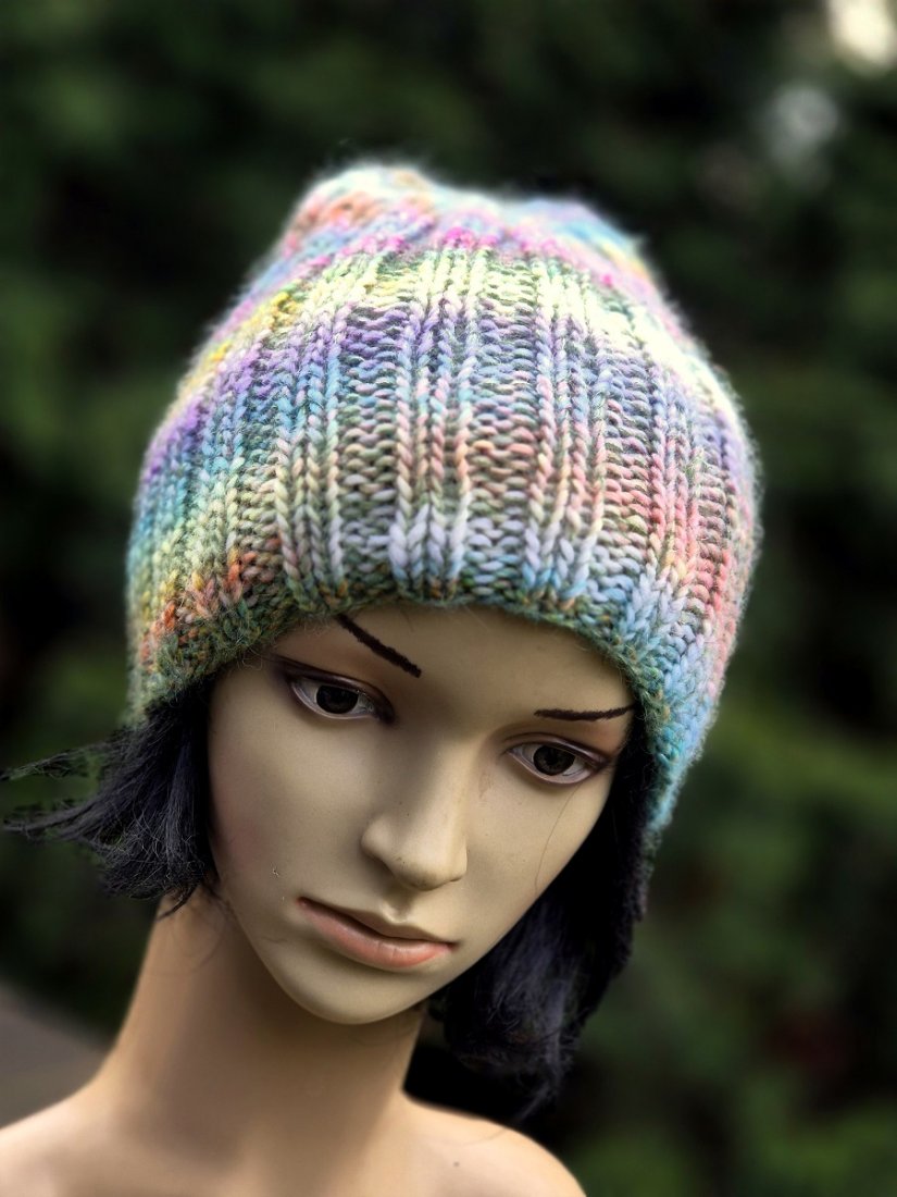 Ciepła, mięsista, miękka i cudowna w dotyku czapka wykonana ręcznie na drutach. Połączyłam cieniutką nitkę 75% kid moher/25% jedwab z włoską kolorową włóczka (50% wełna dziewicza, 50% poliakryl). Czapka bezszwowa, świetnie dopasowuje się do głowy.