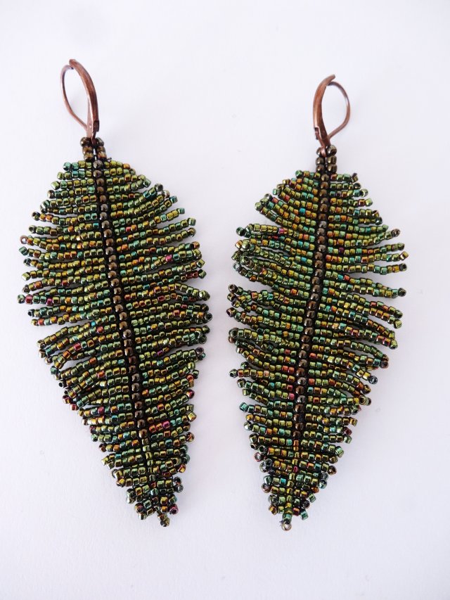 Kolczyki wykonane pracochłonną techniką beading z koralików Toho w odcieniach zieleni zawieszone na miedzianym biglu angielskim w kolorze starego złota.