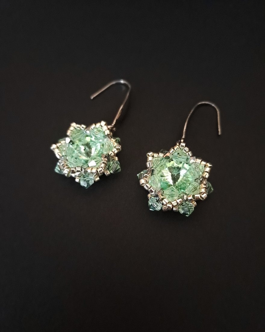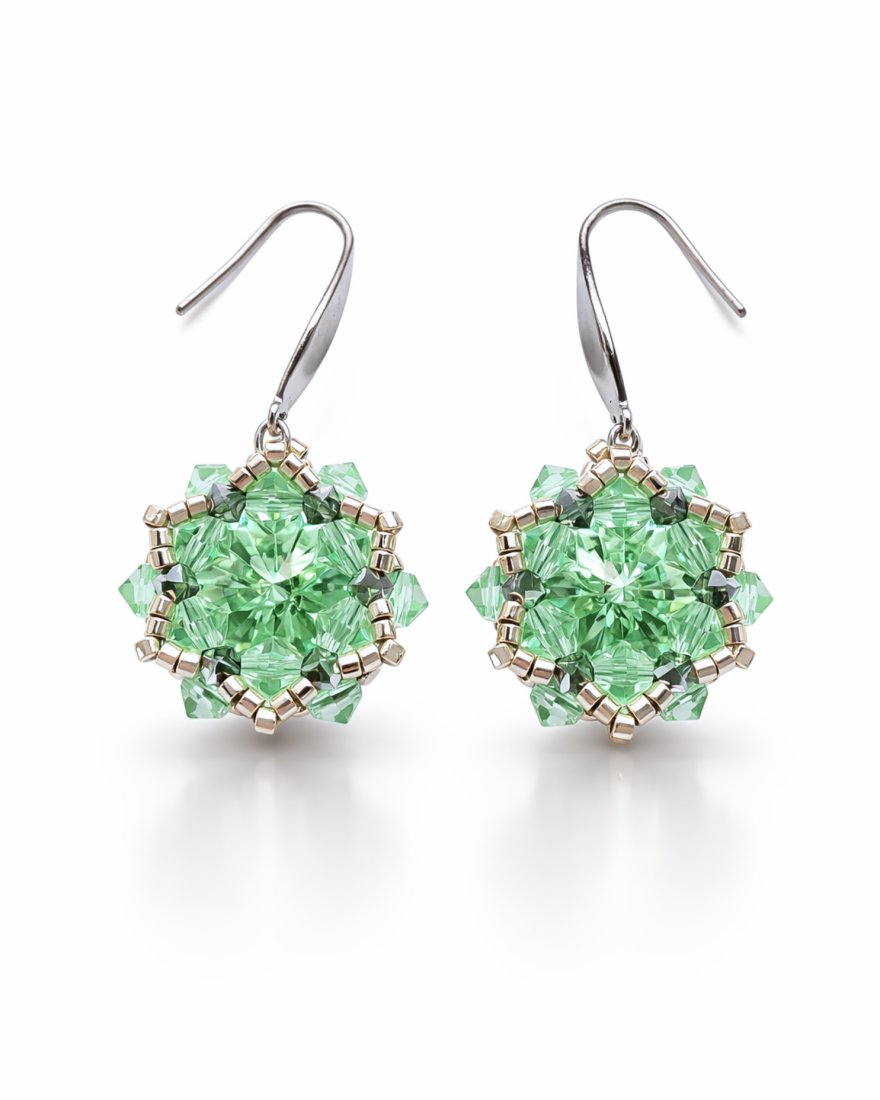 Centralnym elementem kolczyków są kamienie Preciosa Rivoli Maxima o średnicy 12 mm w odcieniu Chrysolite - głębokiej, eleganckiej zieleni o wyjątkowej czystości i blasku. Kamienie otulone zostały kryształkami Preciosa Bicone oraz precyzyjnie dobranymi koralikami Miyuki Delica, tworząc dopracowaną, jubilerską kompozycję.