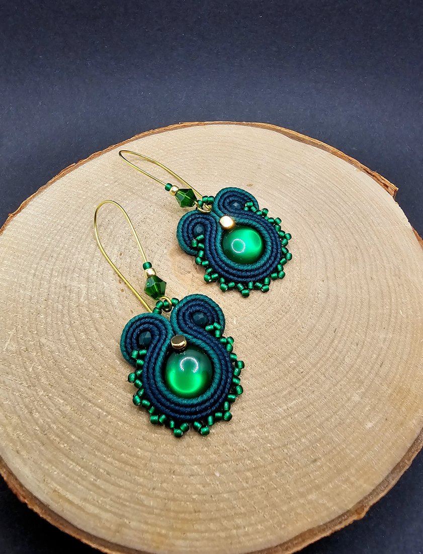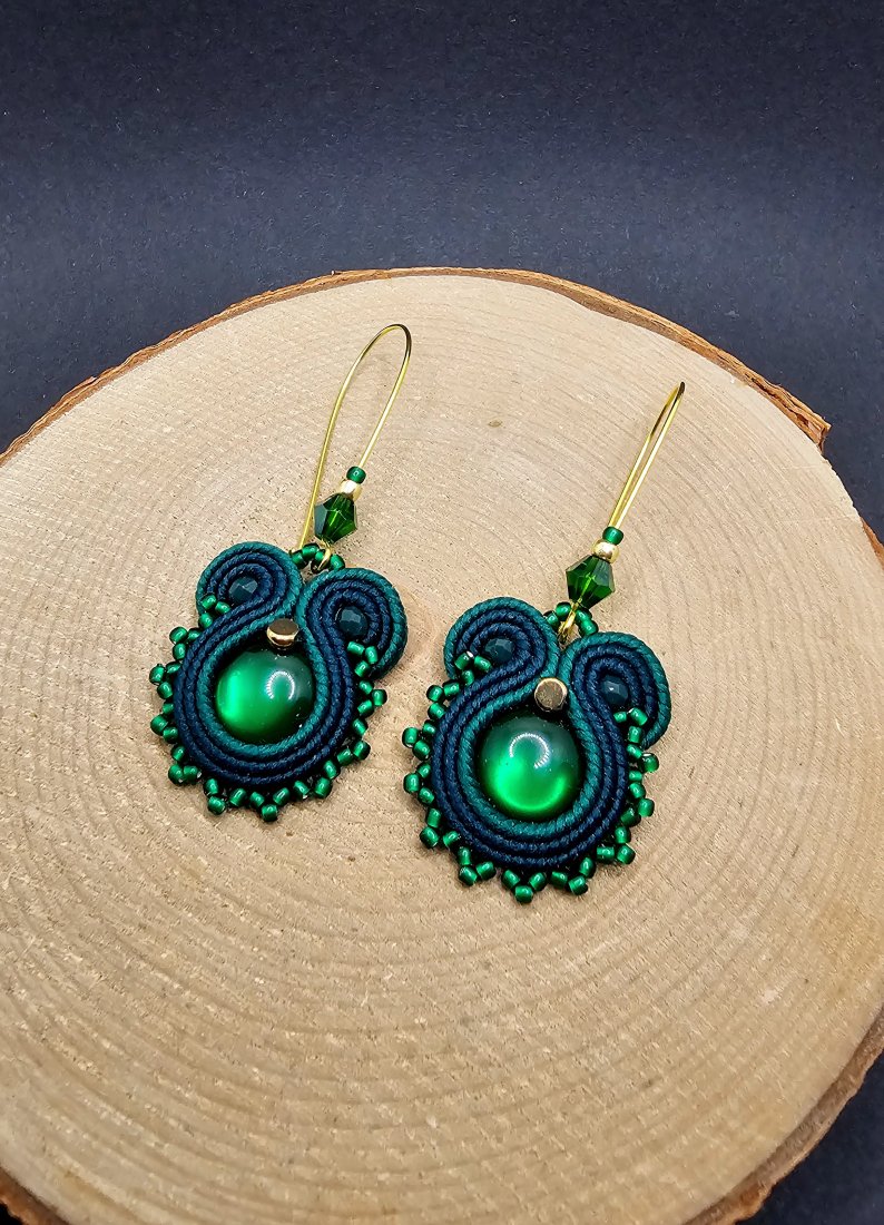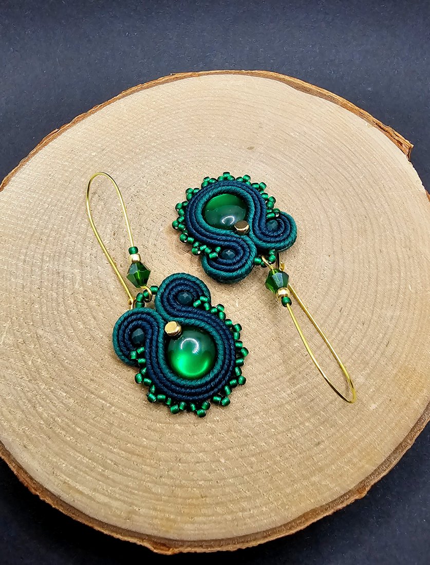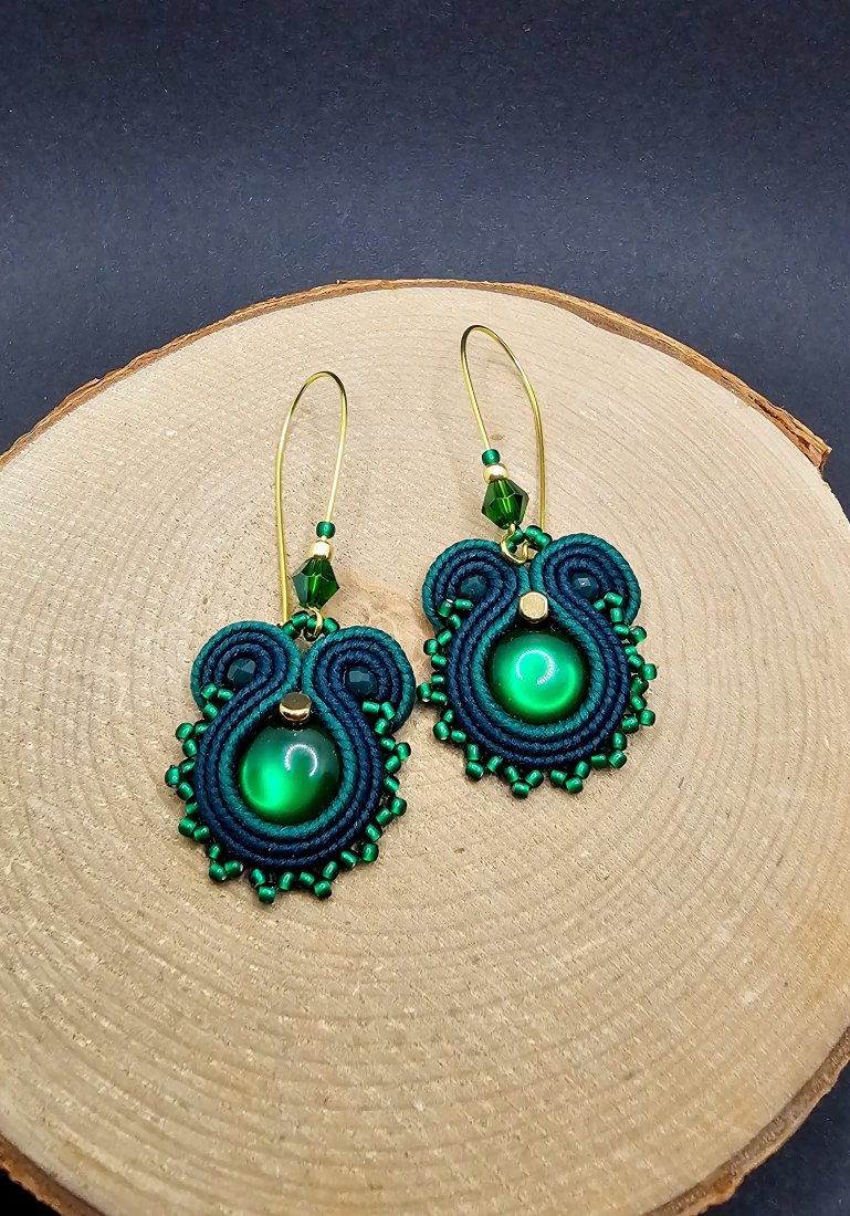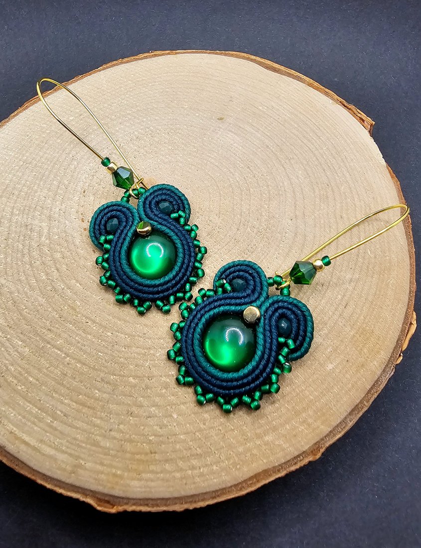 Zielone akrylowe kaboszony otoczone polskimi sznurkami sutasz oraz szklanymi koralikami TOHO i niewielkimi kryształami. Kolory w kolczykach: zielony, ciemny zielony, złoty. Kolczyki zawieszone na długich zamykanych biglach w kolorze złotym.