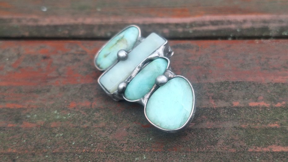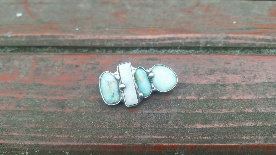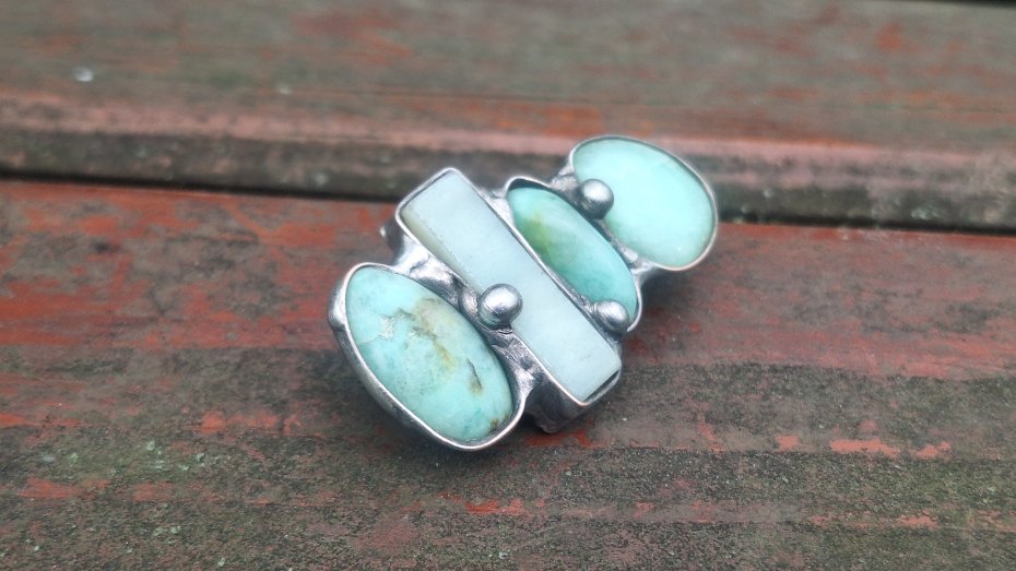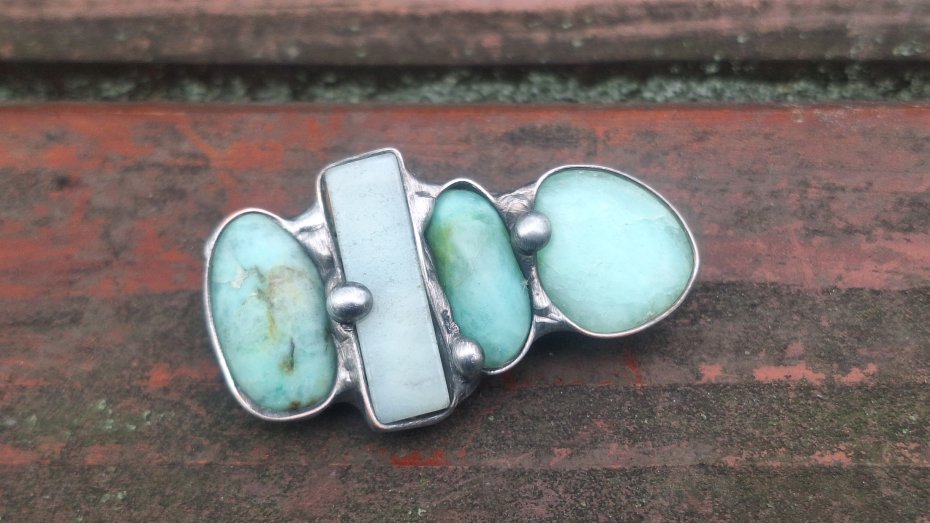 Broszka wykonana z miedzi, cyny, amazonitu i chryzoprazów. Wymiary ok. 4.5 na 2.5 cm. Zapięcie metalowe.