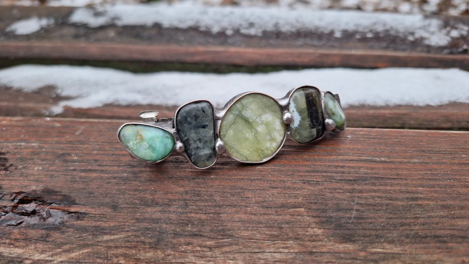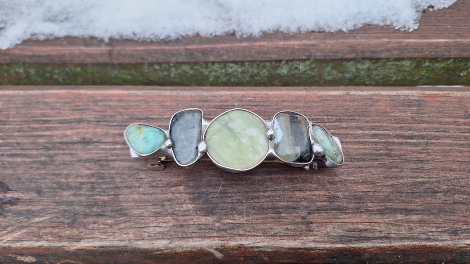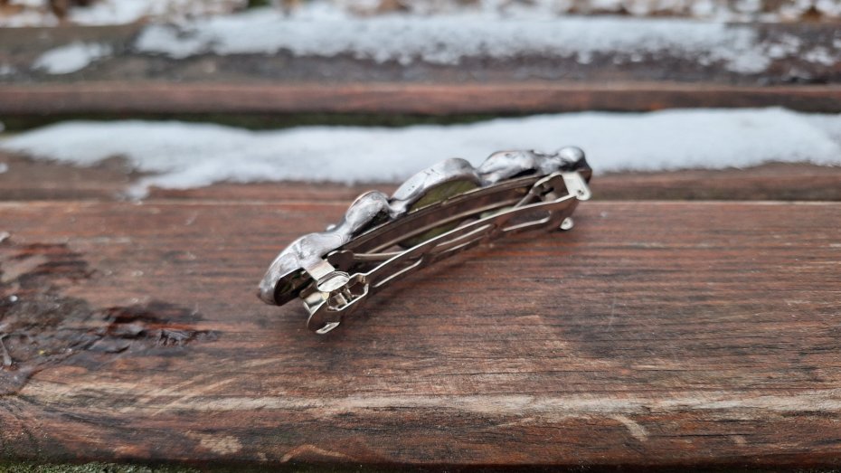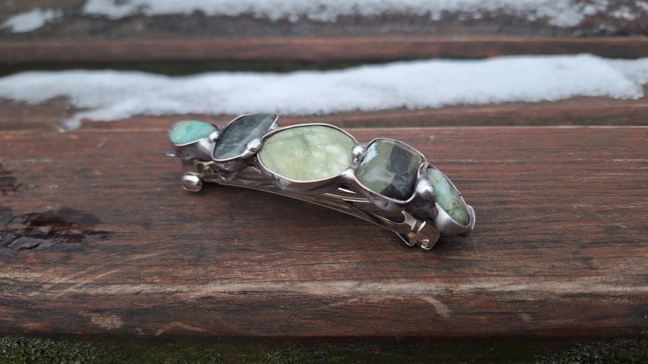 Klamra do włosów, wykonana z miedzi, cyny, prenitów, chryzoprazów i jadeitu. Wymiary ok. 8 na 2 cm. Zapięcie 6 cm, metalowe.