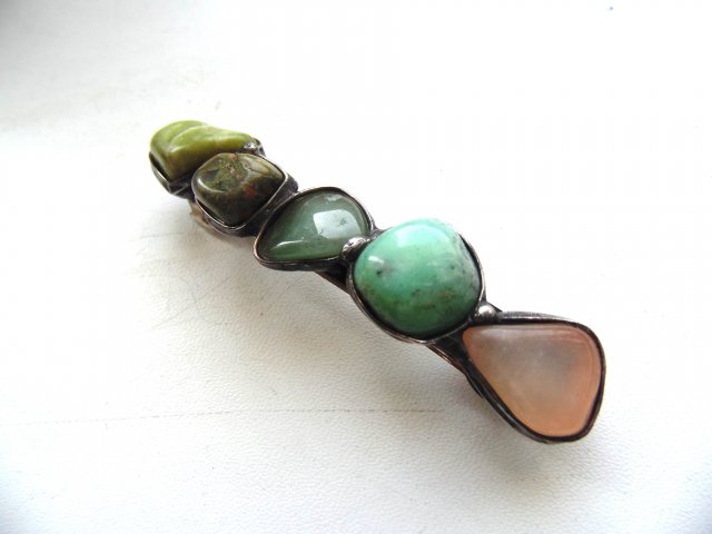 Klamra do włosów, wykonana techniką witrażową z unakitu, serpentynitu, jadeitu, chryzoprazu. Zapięcie metalowe, automatyczne. Wymiary ok. 8 na 1,5 cm.
