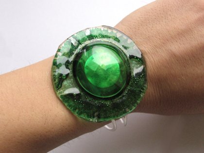 Bransoleta ze szkiełkiem o średnicy ok. 5cm z mnóstwem zielonych bąbelków w środku na posrebrzanej obręczy o obwodzie ok.19cm (z możliwością niewielkiej regulacji).