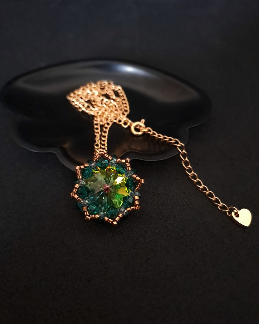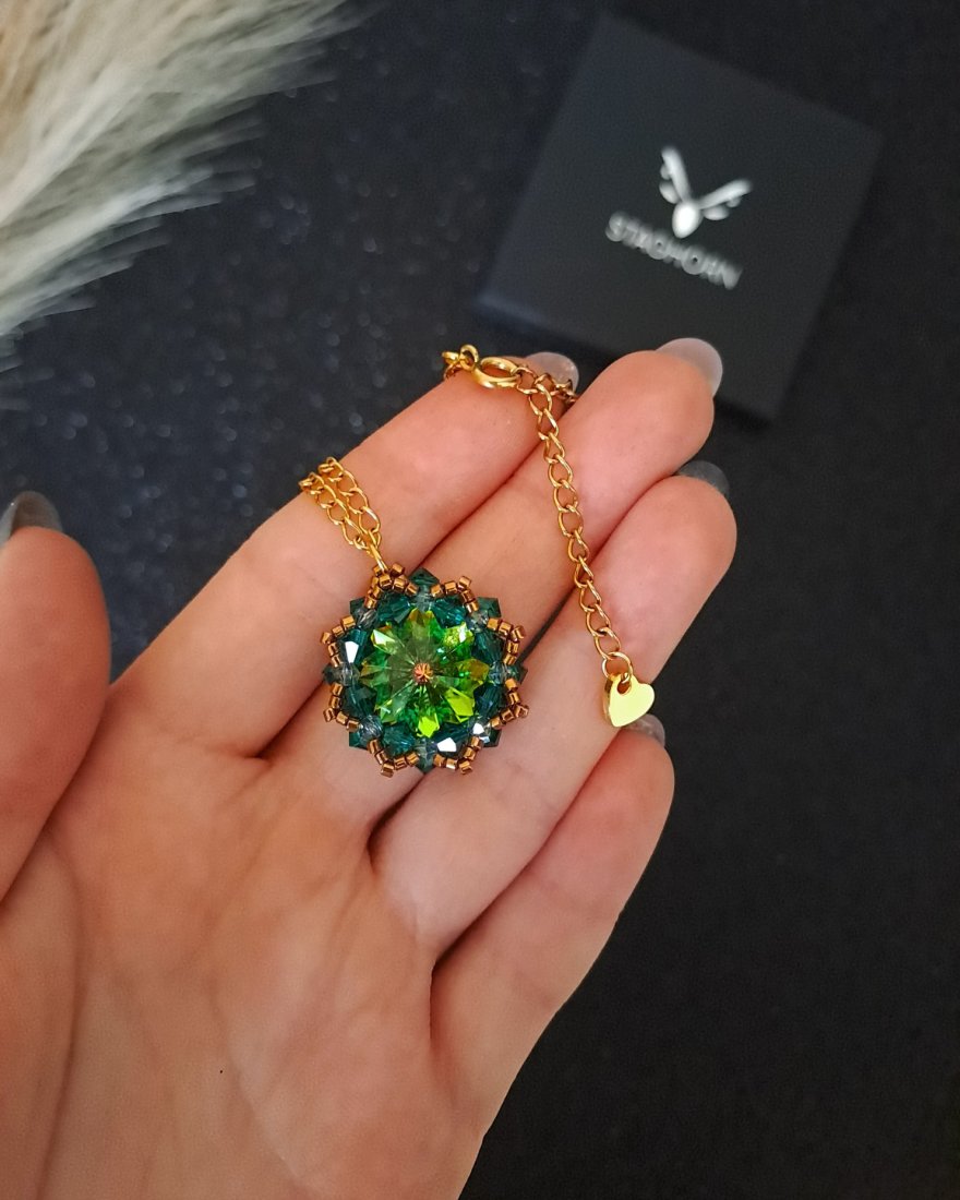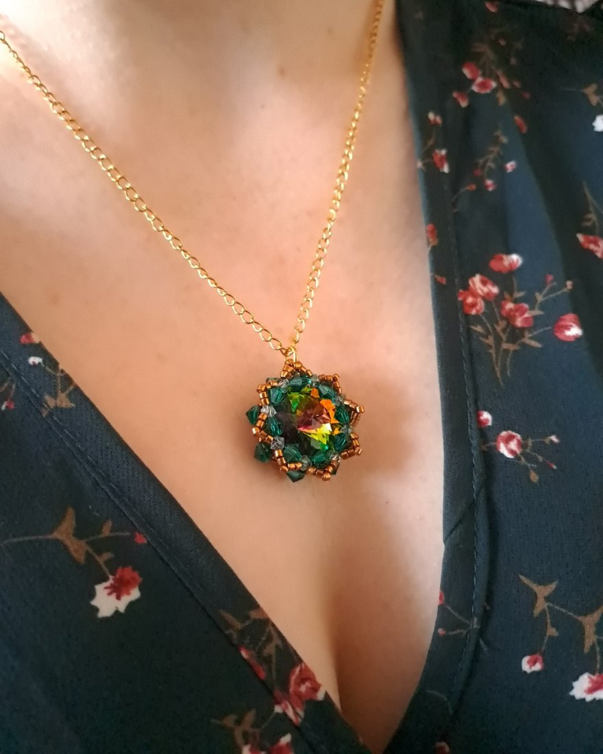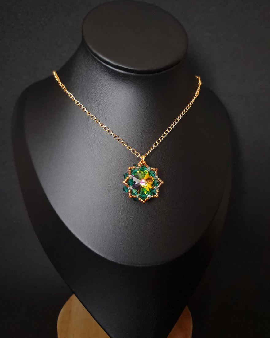 Ręcznie wykonany naszyjnik z kamieniem Preciosa Rivoli Maxima w odcieniu vitrail subtelnie mieni się zielenią, złotem i ciepłymi refleksami fioletu oraz pomarańczu. Otoczony koralikami Miyuki i drobnymi kryształkami Preciosa, tworzy wyrazistą, ale wciąż elegancką kompozycję, która pięknie podkreśla linię dekoltu.
