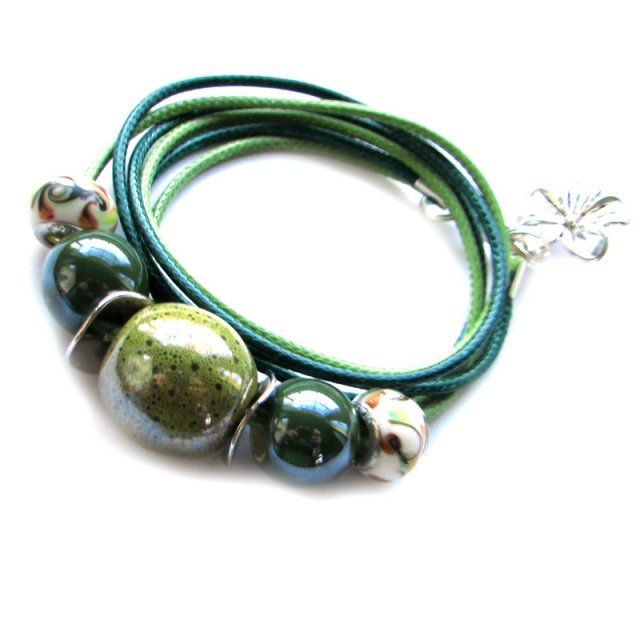 Bransoletka wykonana z zielonego i seledynowego woskowanego sznurka bardzo dobrej jakości, korali ceramicznych, srebrnych młotkowanych przekładek, korali typu pandora oraz dowieszki kwiatka. Do 3-krotnego owinięcia wokół nadgarstka. Długość 54 cm, pasuje na nadgarstek 15-18cm. Zapięcie typu karabińczyk.