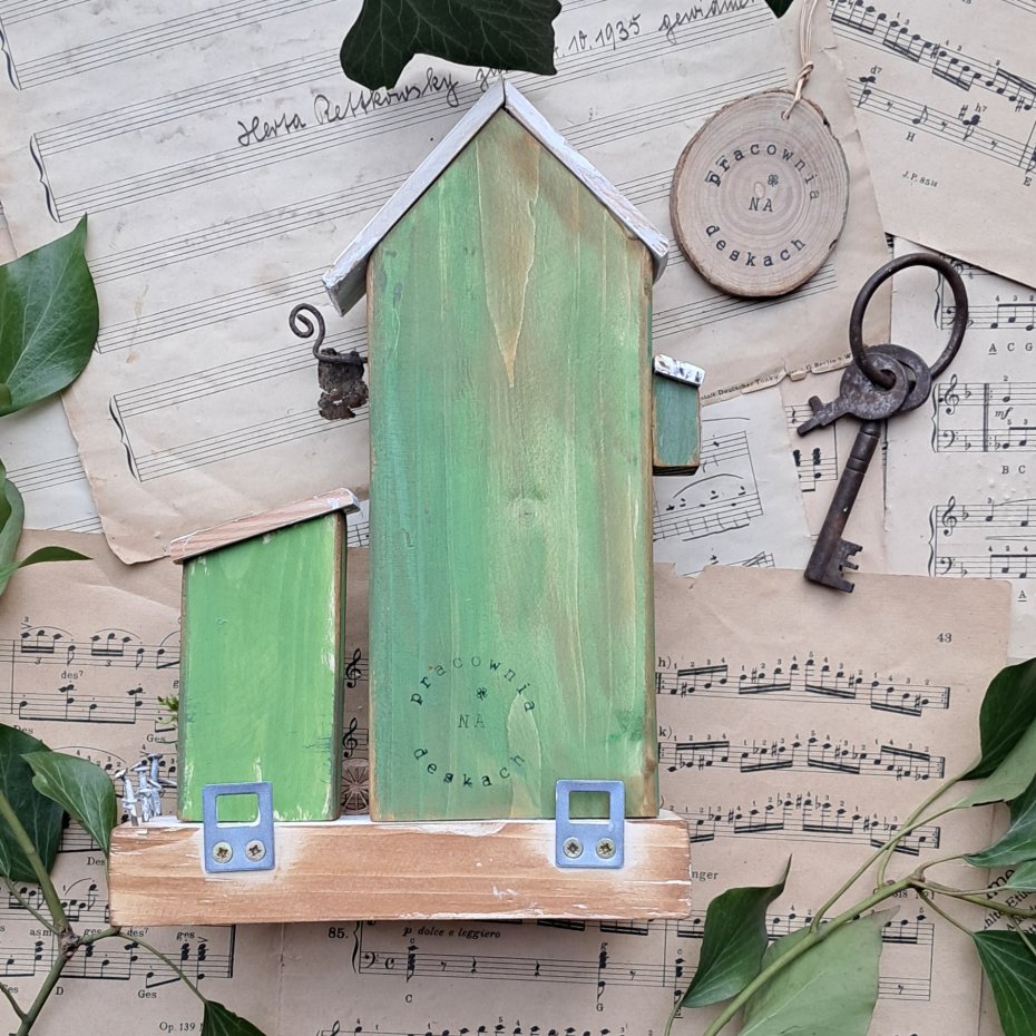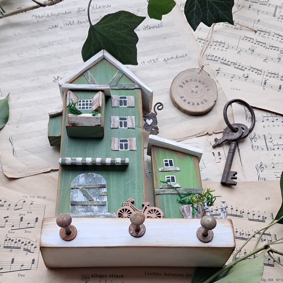 Dla wszystkich wielbicieli drewna i naturalnych dekoracji proponuję rustykany trójwymiarowy wieszak z domkami.
