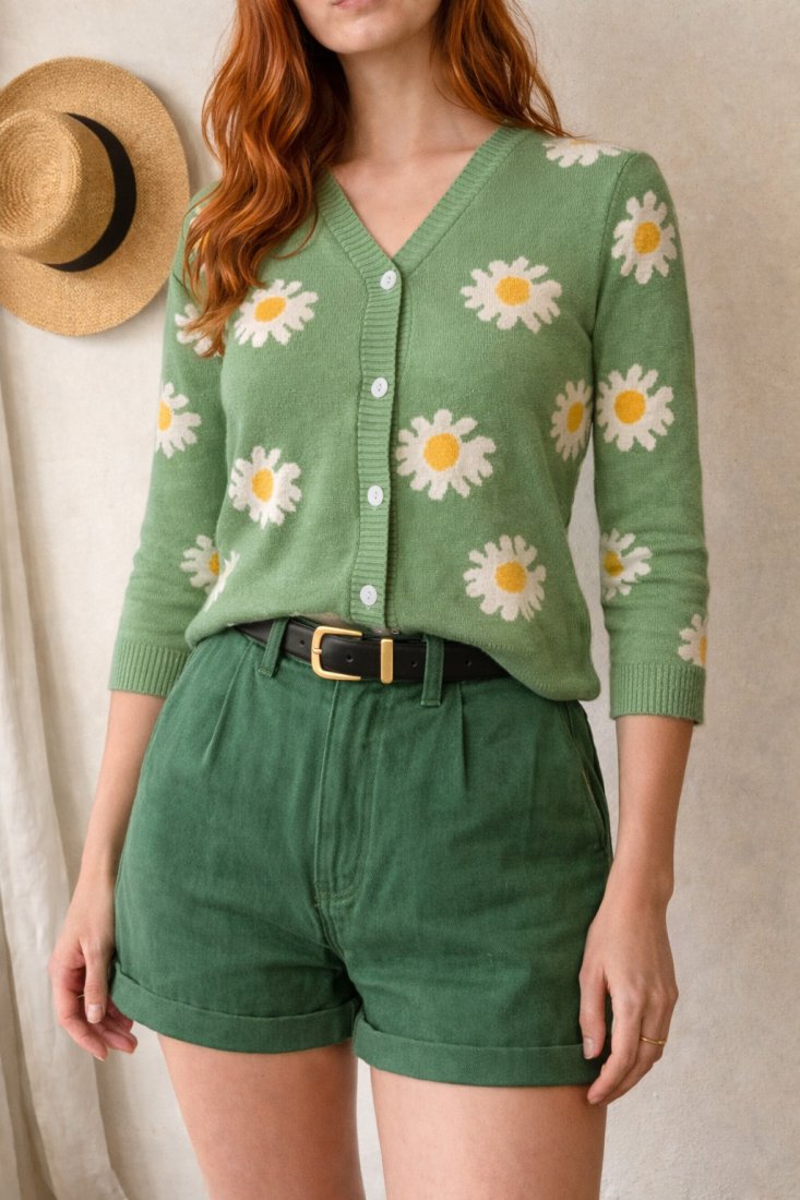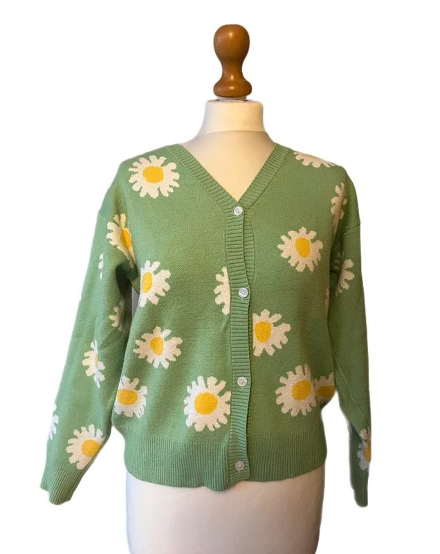 jumper, cardigan, floral, green, daisy, buttoned, soft, comfy
