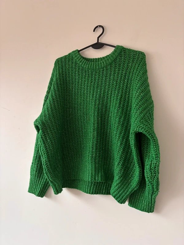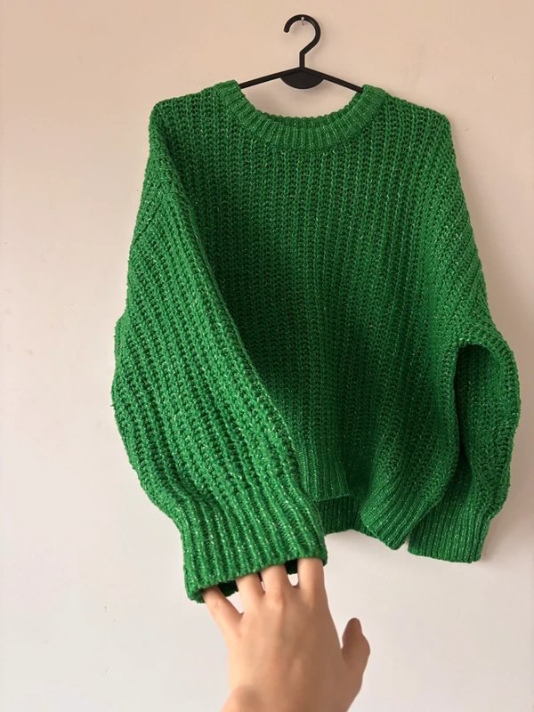 green sweater, chunky sweater, knit sweater, oversized sweater, warm sweater, classic sweater, soft knit, winter sweater, fall sweater, cozy sweater, loose fit sweater, green knit, everyday sweater, basic knit, stylish sweater, women’s sweater, sweater size L, comfy sweater, textured knit, casual sweater