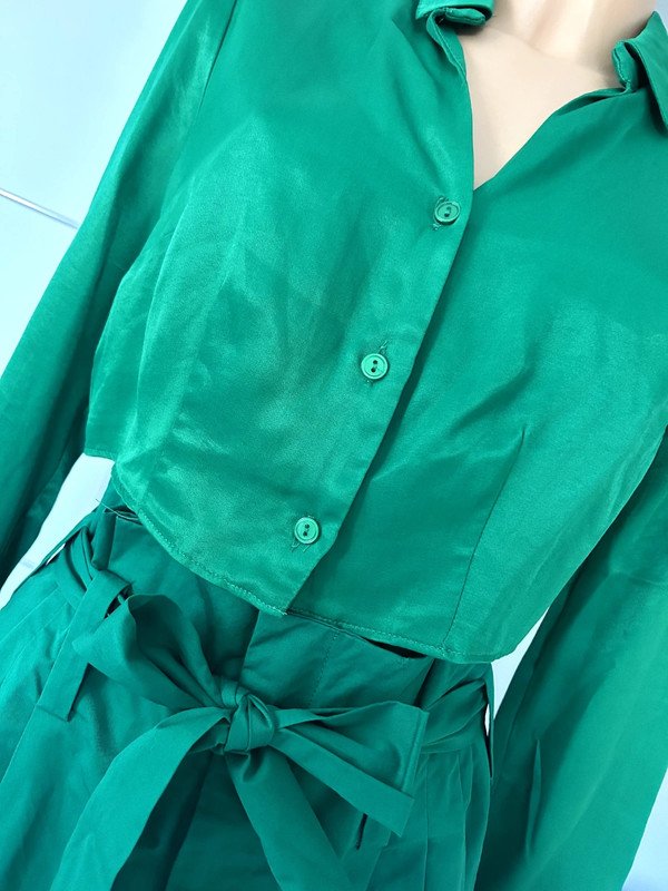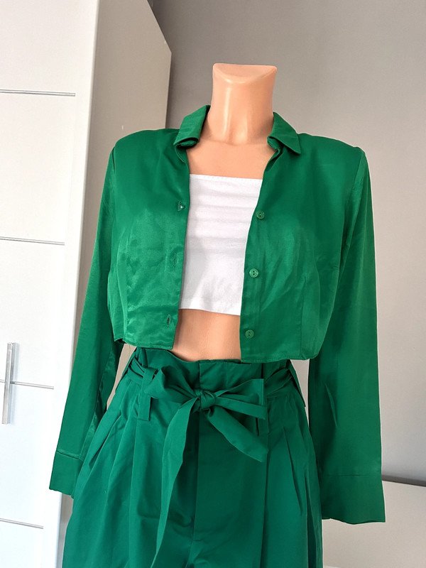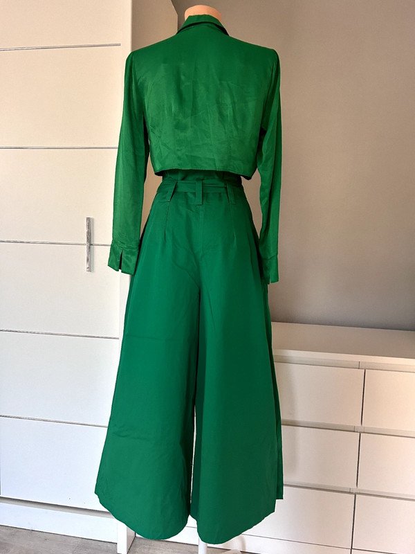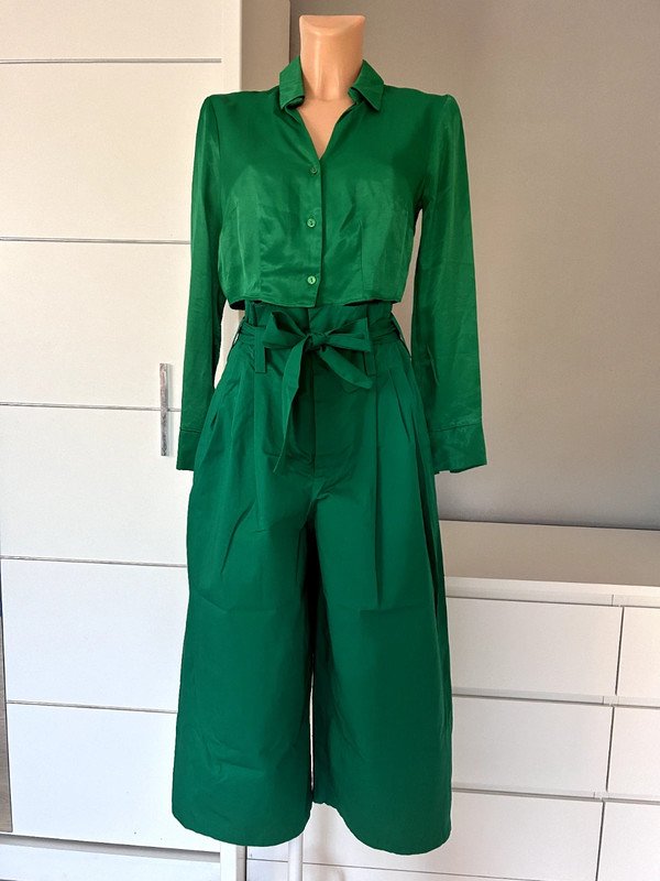 Zestaw w kolorze zielonym. Koszula Primark r. M 38 krótka a'la satynowa 100 % wiskoza, a więc przewiewna. Spodnie firmy Zara szerokie rozmiar S, 100 % porządna, mięsista bawełna, a więc mega przewiewne z wysokim stanem, wiązane w talii paskiem, dzięki temu istnieje możliwość idealnego dopasowania. Spodnie posiadają lekką wadę w postaci mało widocznych plamek na nogawce z przodu od strony wewnętrznej, jednak są prawie niewidoczne, a więc nieistotne podczas uźytkowania, sama mam problem, źeby je znaleźć ???? pokazane na ostatnim zdjęciu.Polecam zestaw jeśli lubisz się wyróżniać.