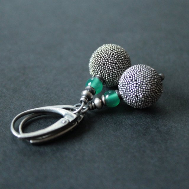 Ekskluzywne kolczyki z serii ze szkatułki babci wykonane zostały z oksydowanego srebra próby 925, kuleczek zielonego onyksu wielkości 0,4 cm oraz kuli bali
