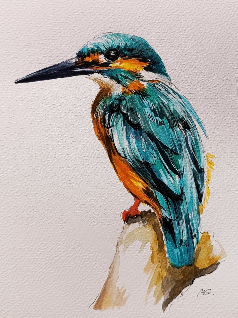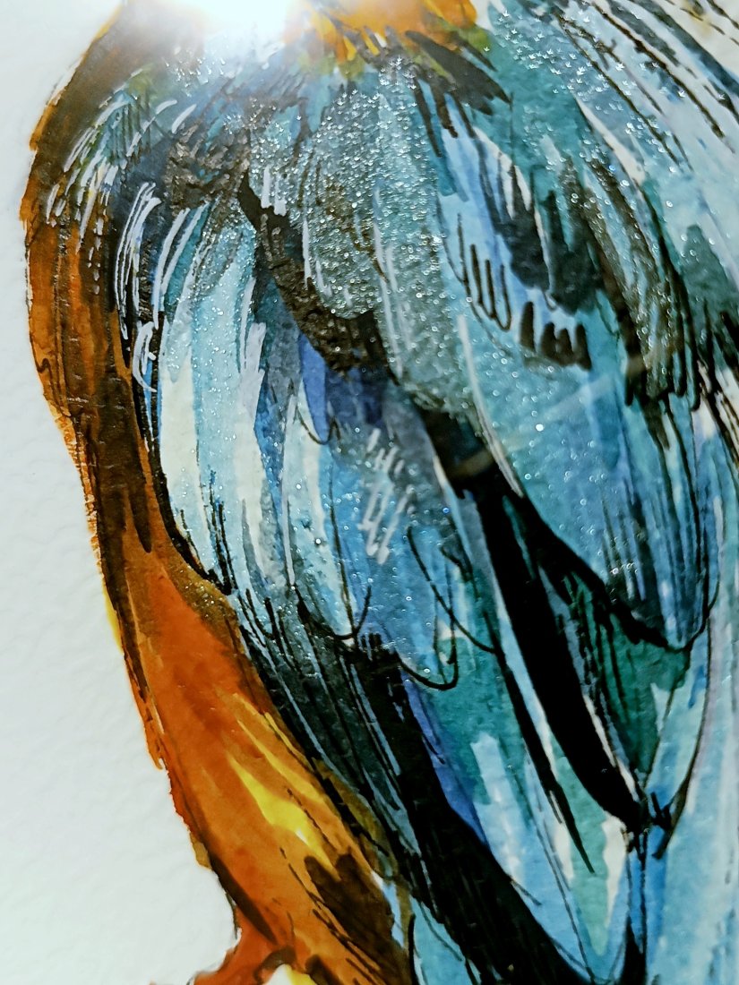 Unikatowa akwarelka przedstawiająca zimorodka. Namalowana na papierze do akwareli 300g, akwarele i tusze Derwent, cienkopisy Winsor&Newton, a także gdzieniegdzie specjalne akwarele z delikatnym metalicznym połyskiem. Akwarela oprawiona jest w ramkę MDF za szkłem, kolor jasnego drewna, wielkość całości 15,2cm x 20,2cm. Jest to produkt unikatowy, wykonany w jednym egzemplarzu, podpisany na odwrocie i sygnowany inicjałami. Obrazek przystosowany do zawieszenia lub postawienia (posiada podpórkę). Ze względu na indywidualne ustawienia ekranów kolory mogą nieznacznie odbiegać od oryginału. Gotowy prezent! Zapraszam, Monika.