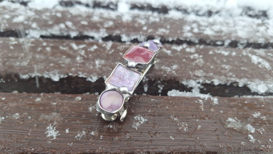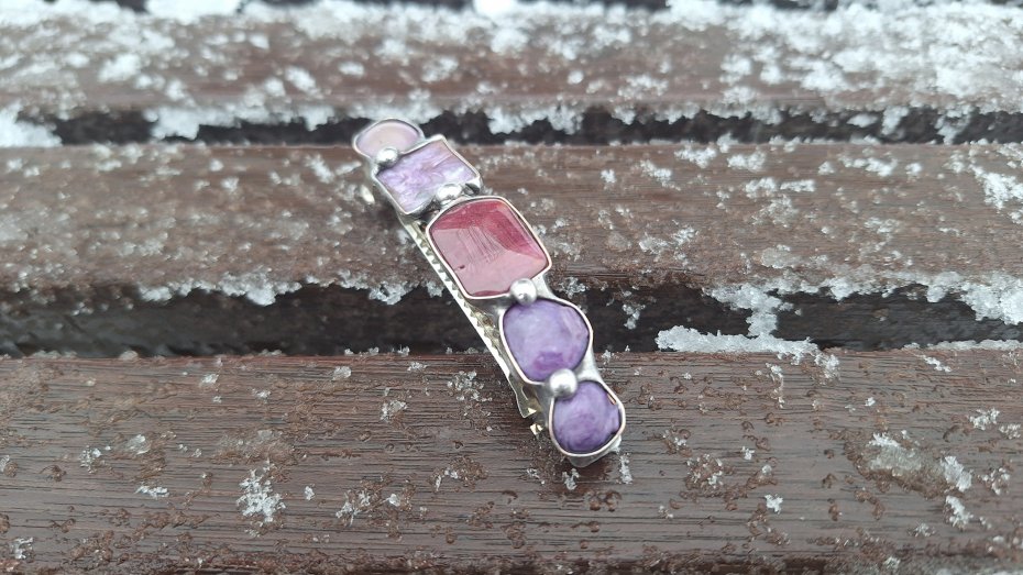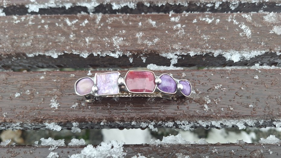 Klamra do włosów, wykonana z miedzi, cyny, czaroitów i jaspisu. Wymiary ok. 8 na 1.5 cm. Zapięcie 6 cm, metalowe.