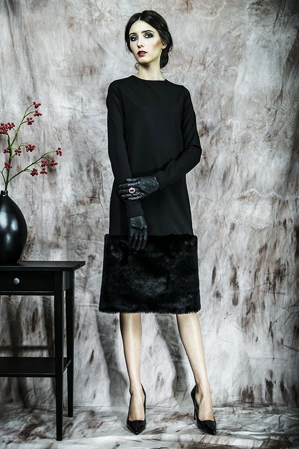 Elegancka sukienka z grubszej dzianiny wykończona ciepłym futrem. Dekolt nieduży klasyczny, z tyłu zapinana na kryty suwak.
