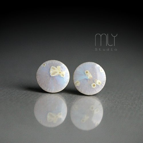 Ceramiczne, lekko nieregularne kolczyki w formie sztyftów, ręcznie wykonane z pięknej delikatnej gliny kamionkowej, jednostronnie szkliwione efektownym kremowobiałym błyszczącym szkliwem z efektem plamek i krystalizacji (rozmieszczenie kryształów może różnić się od widocznego na zdjęciu), na antyalergicznych sztyftach w kolorze srebrnym.Średnica ok. 9mm. Polecam