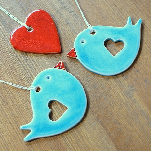 Zestaw 3 ceramicznych ozdób choinkowych (i nie tylko) w postaci dwóch zimowych ptaszków i serduszka.