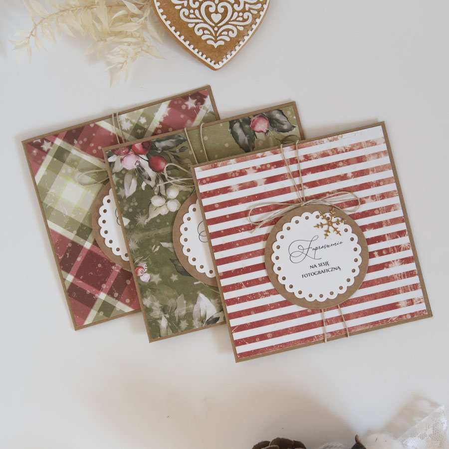 Zestaw trzech ręcznie robionych voucherów bożonarodzeniowych, zaproszeń na sesję fotograficzną.