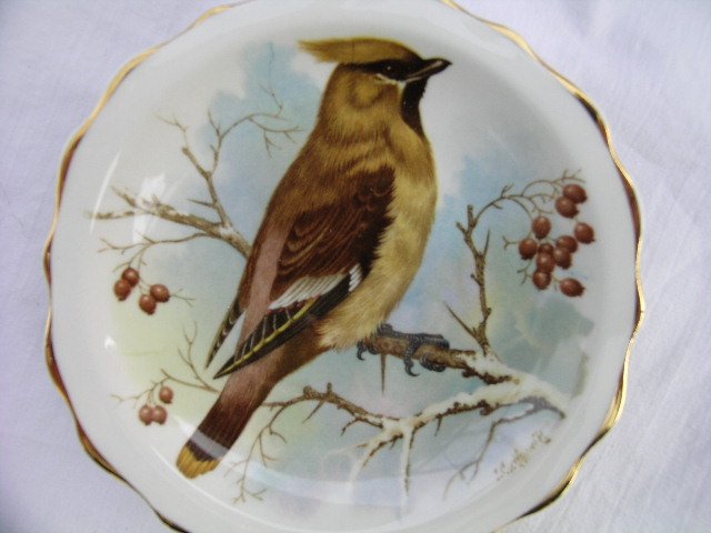 Porcelanowy talerzyk użytkowy i dekoracyjny, sygnowany. Z czuwającą, ptasią malaturą :) Rant fikuśnie falbanowany, złocony. 11,5 x 1,5 cm. Stan zachowania bardzo dobry.