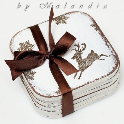 Komplet 6 podkładek z rozbrykanym reniferem, do postawienia kubków z rozgrzewającymi napojami. Pięknie będą wyglądały na świątecznym stole, sprawią też wiele radości przez cały zimowy czas.