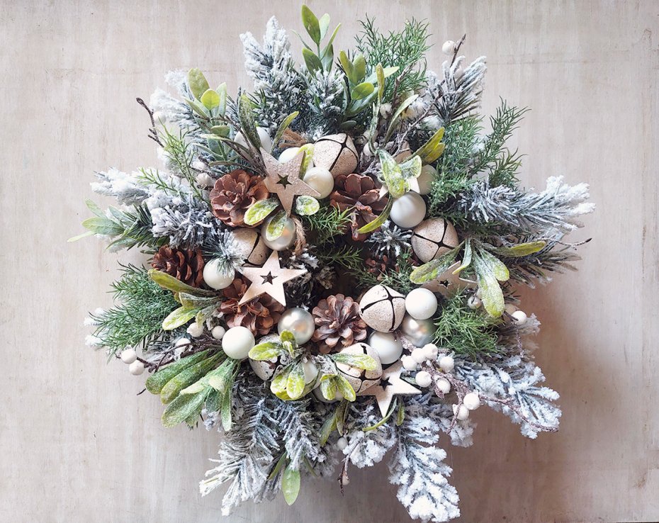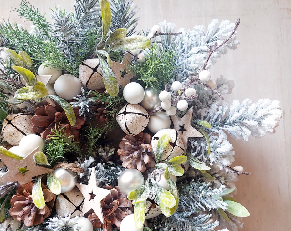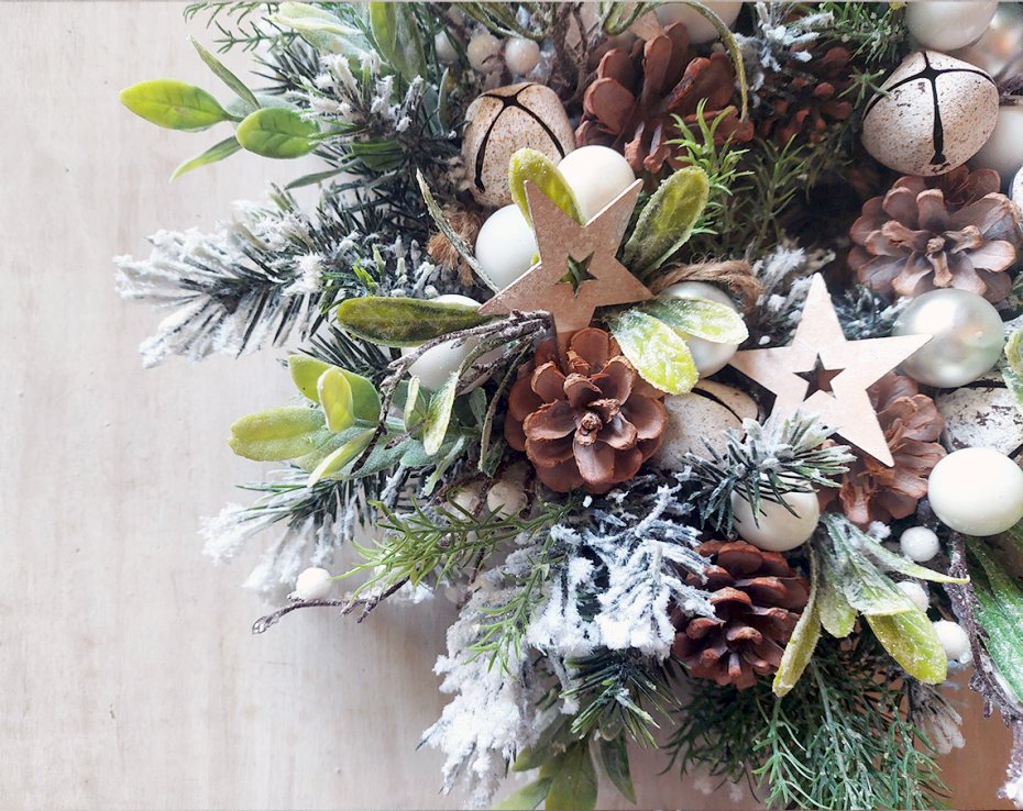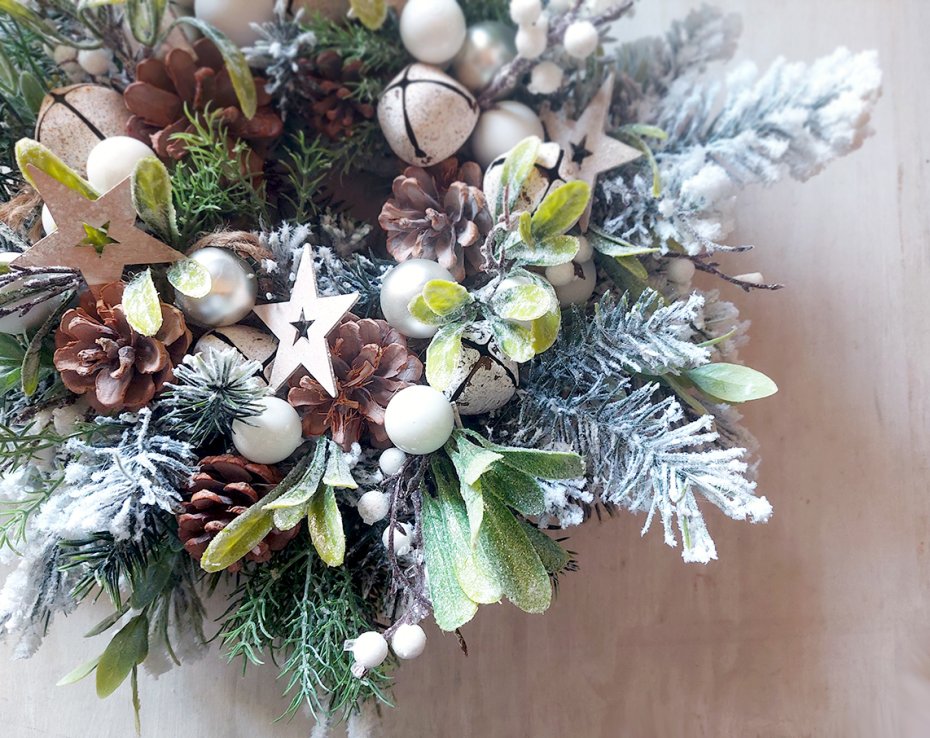 Niebanalny, świąteczny wianek w oryginalnej kolorystyce. Wykonany z wysokiej jakości ośnieżonych sztucznych gałązek świerku, drobnych białych owoców. Udekorowany bombkami, szyszkami i janczarami. Będzie trwałą ozdobą, która świetnie prezentuje się zarówno zawieszona jak i położona np. na stole. Starannie przechowany, będzie cieszył przez wiele świątecznych sezonów. Średnica ok. 35cm