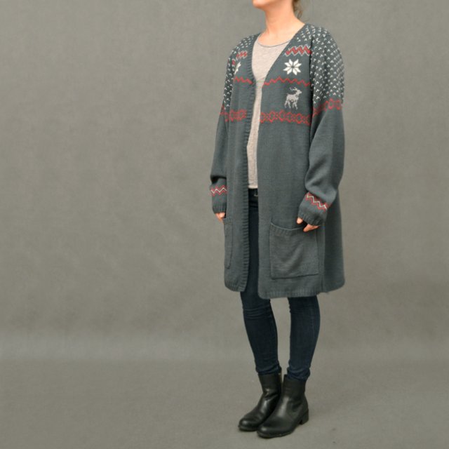 Dłuższy rozpinany sweter w zimowy wzór. W połowie z wełny. Kolor troszkę bardziej wpada w morski niż na zdjęciu.