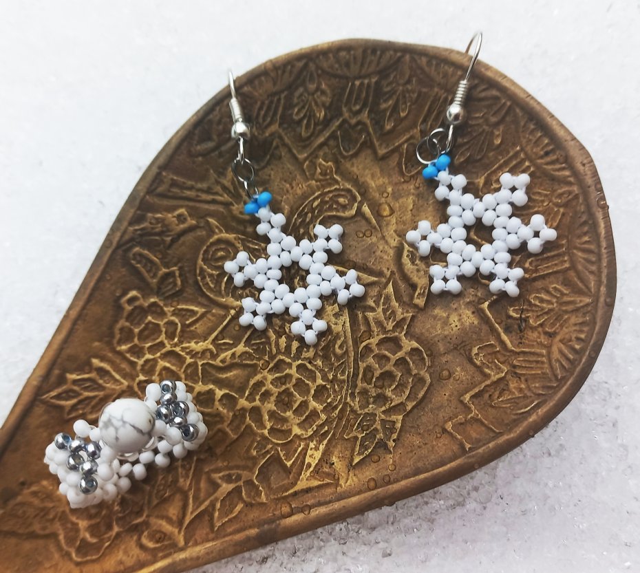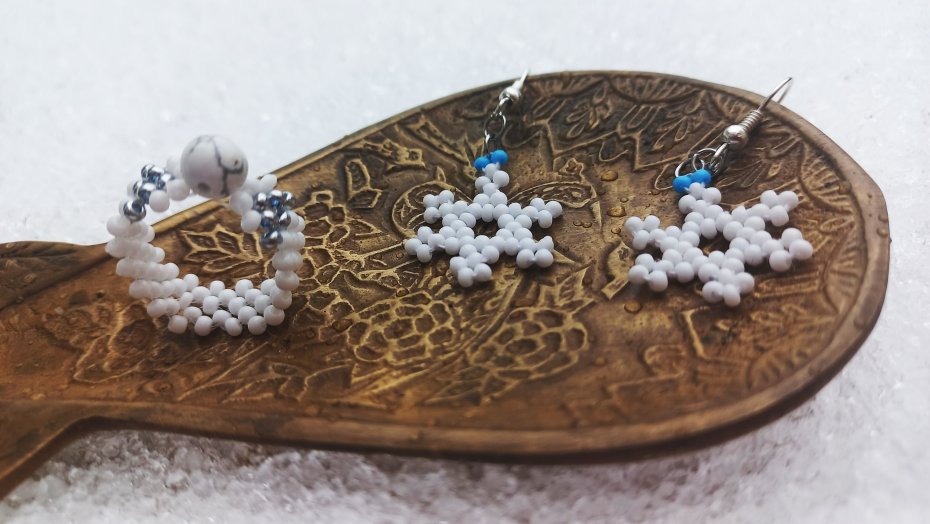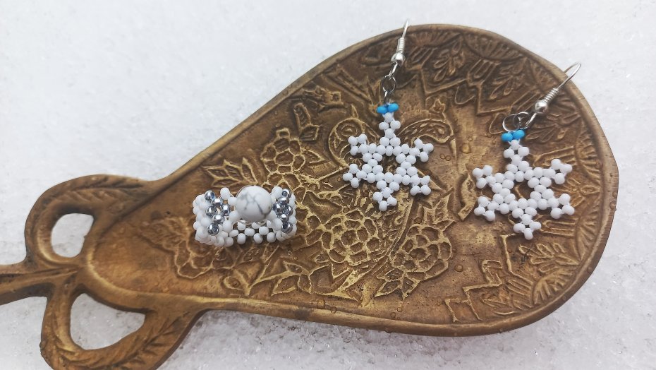 Pierścionek upleciony masajskim splotem, w centralnym miejscu umieszczony został piękny naturalny biały Howlit. Kolczyki to delikatne i nieduże gwiazdki. Wszystko z dobrych jakościowo koralików szklanych czeskiej firmy Preciosa. Pierścionek ładnie prezentuje się na palcu i jest bardzo wygodny w noszeniu. Elastyczna żyłka dopasowuje się do palca i jest bardzo trwała.