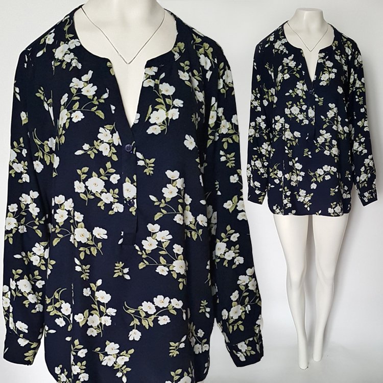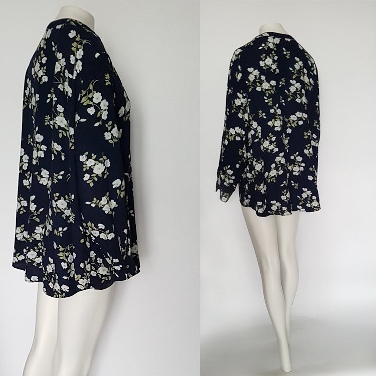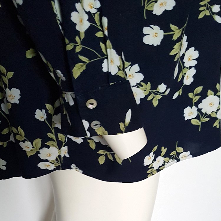 Bluzka damska z przyjemnej, lejącej wiskozy, w kolorze granatowym w jasne kwiaty. Dekolt V do połowy zapinany na guziki, rękawy długie zakończone wąskim mankietem. Tył półokrągły, nieco dłuższy niż przód.