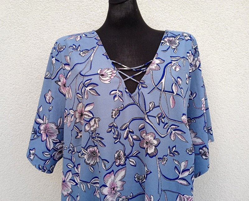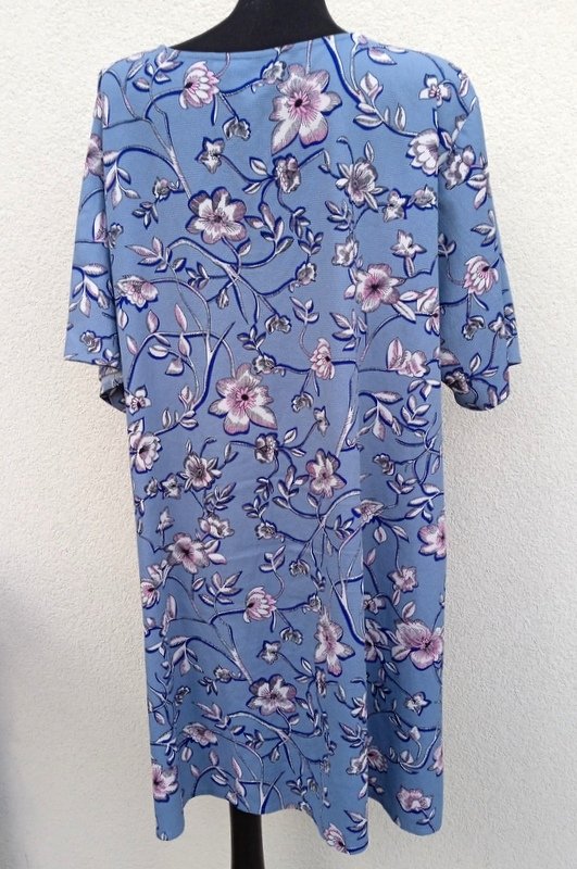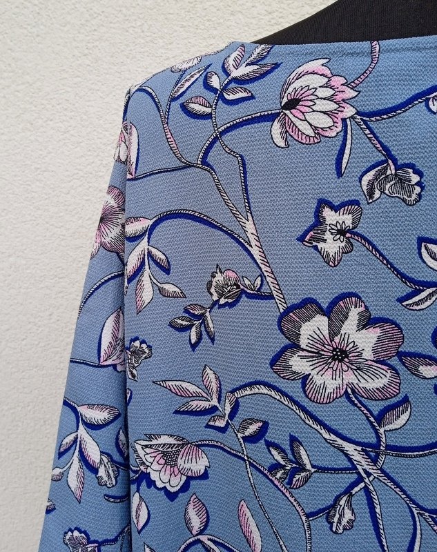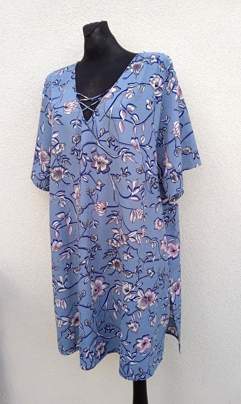 Wzorzysta luźna sukienka z poliestrowej tkaniny z chropowatą fakturą w zgaszonym niebieskim kolorze z wzorem kwiatowym w w kolorach bieli, różu i granatu. Trapezowy fason z małymi rozcięciami po bokach, dekolt w szpic .