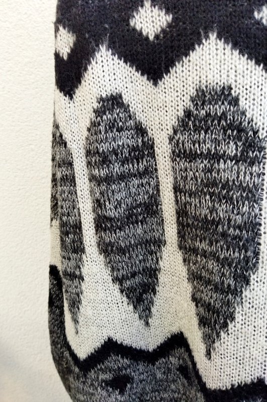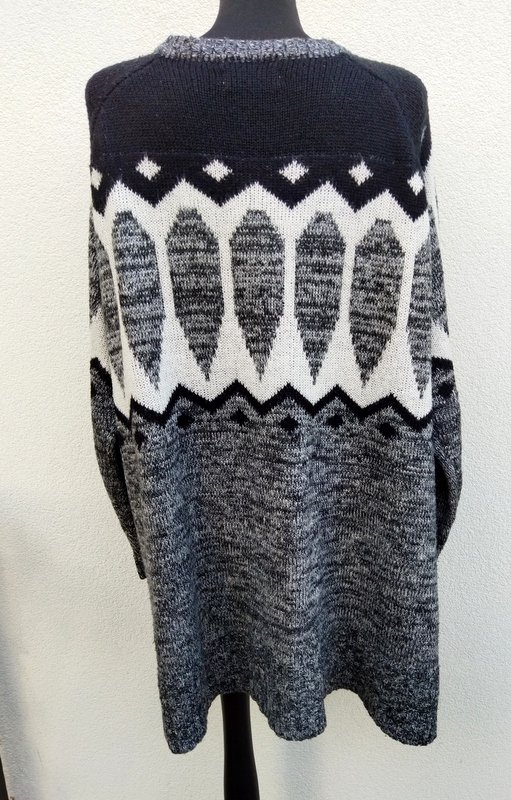 Dłuższy sweter w biało-czarne wzory na melanżowym czarno-białym tle. Fason otwarty, lekko poszerzany do dołu, raglanowe rękawy. Wykończony ściągaczami.