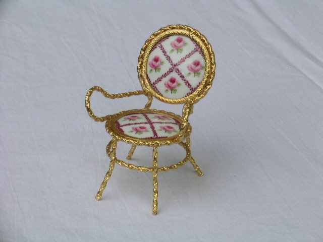 Cudownie złote miniaturowe krzesełko-fotelik. Ciekawe połączenie skręcanego metalu z różanie zdobnymi porcelanowymi medalionikami. Bardzo kobiece, wielce oko przykuwające, niespotykane. Sygnowane Regal. 6,5 x 6 x 8 cm. Stan zachowania bardzo dobry.