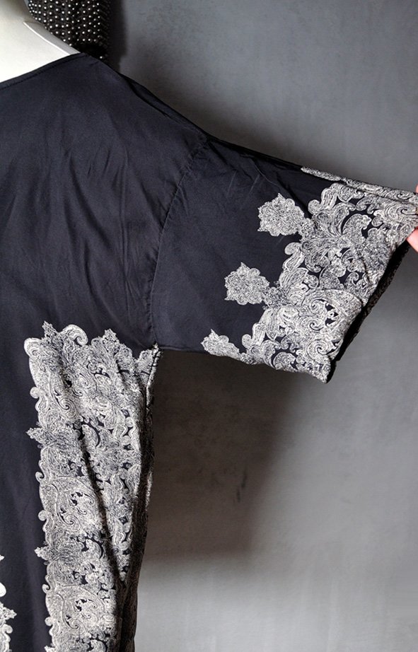 Fason kimonowy: obniżona linia ramion, szerokie rękawy sięgają do łokcia (usztywnione lekko od wewnątrz dodatkową warstwą materiału) pięknie trzymają formę.