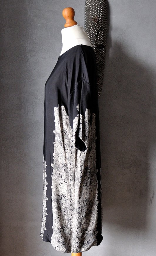 Uszyta ze świetnej jakości wiskozy w przepiękny wzór. Materiał czarny w beżowobiały, bogaty, orientalny print - misterną arabeskę. Idealnie wykrojony, układa się symetrycznie.