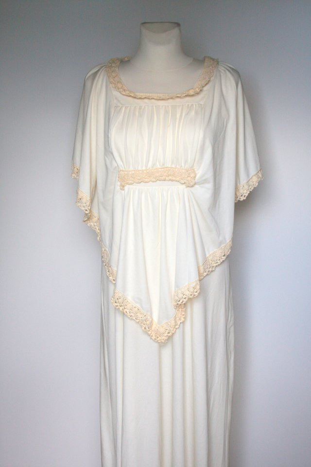 zjawiskowa niesamowita maxi sukienka vintage z lat 70-tych w kolorze ecru, ażurowe wykończenie , sukienka bez rękawów z górą w postaci jakby zwiewnej narzutki zszytej z całością, z tyłu zapięcie na suwak