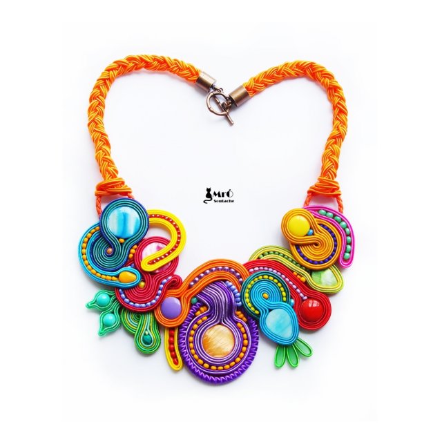 Niepowtarzalny naszyjnik pełen szaleństwa barw i form. Mój ulubiony rodzaj naszyjników. Przyciąga uwagę i sprawia, że ciężko od niego oderwać wzrok. Idealny na sezon wiosna/lato. Naszyjnik wykonany jest z klejonych kolorowych sznureczków z dodatkiem szklanych kolorowych koralików, Preciosa, Fire polish,masy perłowej . Wszystkie elementy są ze sobą zszyte nićmi. Naszyjnik jest starannie wykończony. Zapinany jest na szklany koralik. Fantastycznie komponuje się z prostą sukienką czy bluzką. Obwód wokół szyi- 50 cm. Jest zaimpregnowany bardzo dobrej jakości preparatem chroniącym przed kurzem i wilgocią oraz wykończony filcem.