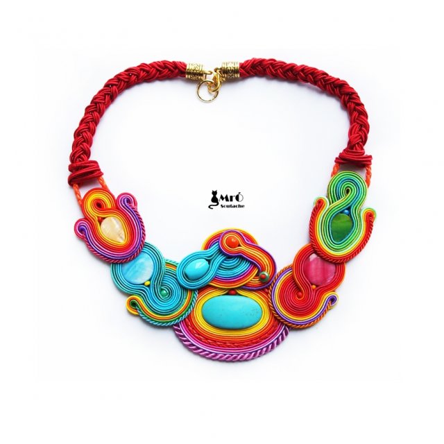 Niepowtarzalny naszyjnik pełen szaleństwa barw i form. Mój ulubiony rodzaj naszyjników. Przyciąga uwagę i sprawia, że ciężko od niego oderwać wzrok. Idealny na sezon wiosna/lato. Naszyjnik wykonany jest z klejonych kolorowych sznureczków z dodatkiem howlitów i masy perłowej . Wszystkie elementy są ze sobą zszyte nićmi. Naszyjnik jest starannie wykończony. Zapinany jest na szklany koralik. Fantastycznie komponuje się z prostą sukienką czy bluzką. Obwód wokół szyi- 50 cm. Jest zaimpregnowany bardzo dobrej jakości preparatem chroniącym przed kurzem i wilgocią oraz wykończony filcem.