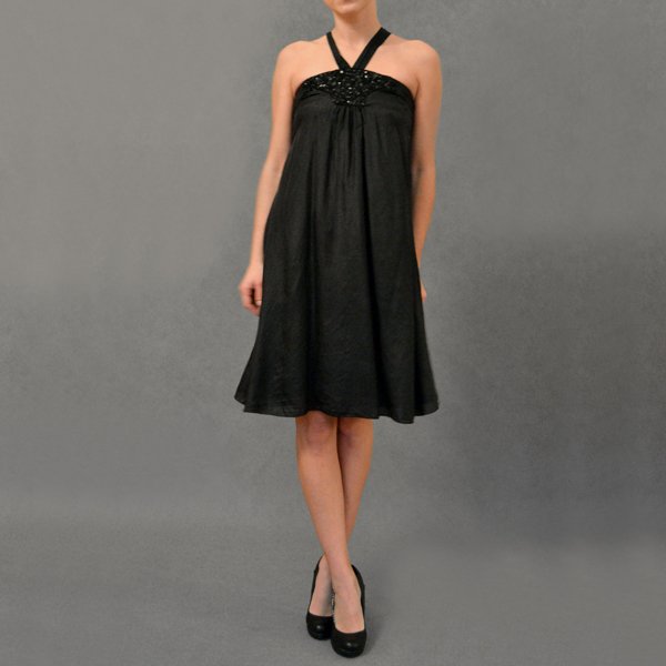 Czarna, jedwabna sukienka. Przy dekolcie ozdobiona czarnymi błyszczącymi koralikami. Na ukośnych ramiączkach. Krój luźny, rozszerzający się ku dołowi. Świetnie kryje niedoskonałości figury. Na podszewce. Jedwab bardzo delikatny tzw. habutralisilk. Z boku zameczek.