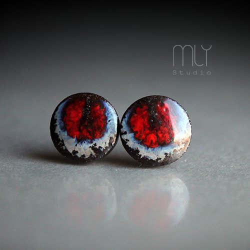 Ceramiczne kolczyki w formie sztyftów, ręcznie wykonane z delikatnej gliny kamionkowej, jednostronnie szkliwione mieszanką szaro czerwonych szkliw z efektem plamek, na posrebrzanych sztyftach.Średnica ok. 11mm.Polecam